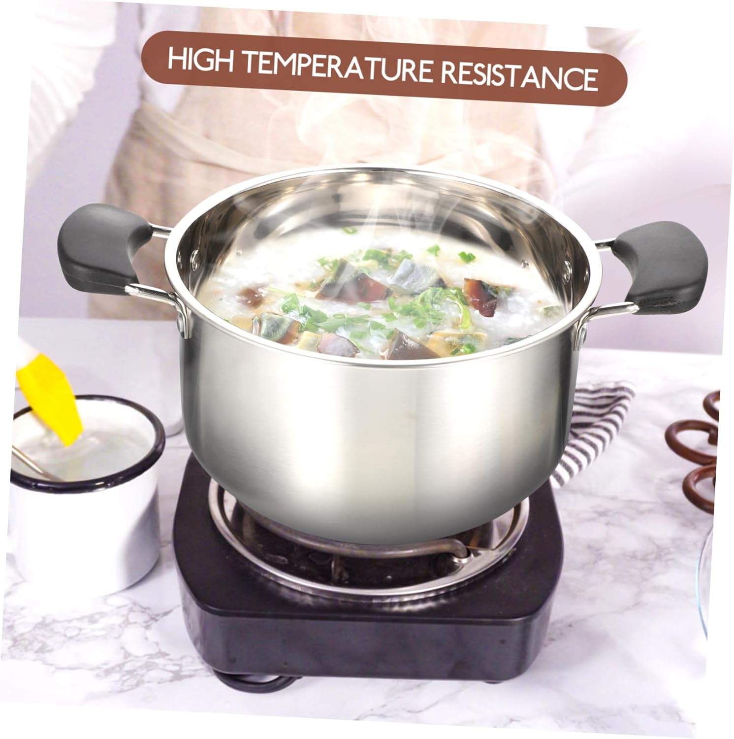 Package List 1 x Lidded Soup Pot Features - Material: Stainless steel, plastic dual handle pot - Size: 26.00X26.00X16.00cm/10.22X10.22X6.29in Multi-functional Pot - craftsmanship and material make this cooking pot look simple yet household pot. - With fine workmanship, it is and not easy to break, and provide a long serving time Small Steam Pot. - Kitchen Pot - Soup Pot is compact in size, not taking up much space, you can easily store it after use Household Cooking Pot. - Designed with lid, this cooking pot is convenient to use, make your cooking process more Soup Pot. - Convenient and portable for simple using with and protective double-handle design Cooking Boiler.Goods DescriptionCongee Saucepan A helper in kitchen.food grade Cookware Ergonomic handle for easy access.Food Pot A very household cooking pot.Soup Pot This is a household soup pot, made of stainless steel, plastic, and .Multi-functional Pot You can cook noodles, soup, hot pot, etc