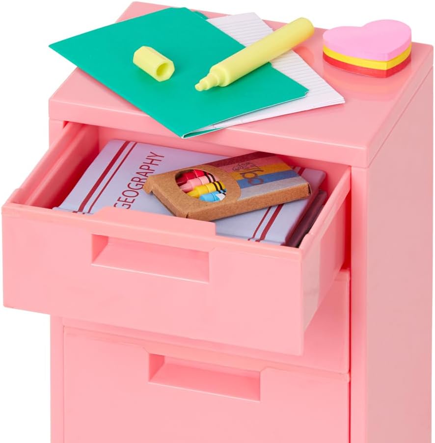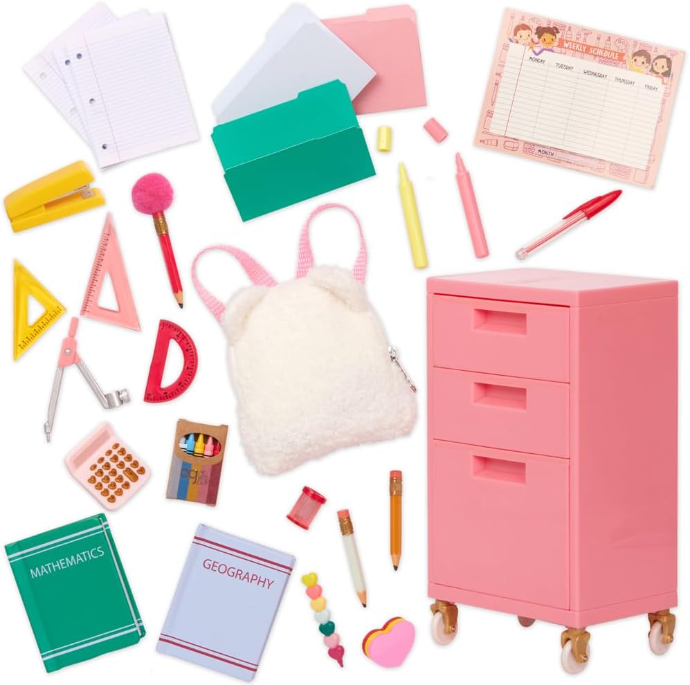 School room supplies includes storage cabinet with play scissors, books, notebooks, eye glasses, pens, rulers, paper, tape dispenser, tote, and goldfish bowl.