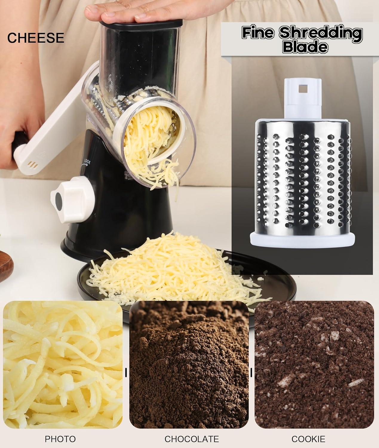 What will you get: 1.A round mandolin slicer with 3 drum blades - slice blade, coarse shredding blade and fine shredding blade. 2. A salad spinner 3. Peeler*1 4. Cleaning brush*1 Features: -Salad spinner One product does more than one job: A salad spinner means a salad serving bowl, a vegetables and fruit cleaner, a colander and a container for storing vegetables and fruits and more. Only 4 steps to get your crisp salad: 1, Place the cleaned vegetables and fruits in the center drain basket. 2, Close the lid and press down on the handle. 3, When the vegetables have dried, press the break button to stop the salad spinner. 4, Put the dried vegetables in our clear bowl, pour in salad dressing, and you're ready to enjoy a delicious salad. How to release and retract the handle: Press down on the handle, open the lock next to it, then slowly release your hand, and the handle comes out. When you are not using the salad spinner, you can press the handle down and then lock the lock so that the handle is reclined. Matters needing attention: The brake can be removed, please remove the brake in advance when cleaning. Please don't put the white drain basket in the dishwasher, it may cause deformation. -Cheese grater : 1.BPA free plastic. Not easy to crack. 2.430 Stainless Steel: 3 drum blades made from Germany are anti-rust. 3.Stronger suction cup: we designed a larger suction cup especially to allows the xxx to catch your countertop tightly. Don’t worry about slip down while in use. 4.The blades are dishwasher safe, and other plastic parts just need to shrink under the water. 5.No electricity needed. Easy to clean and use. Don't need to worry about water entering the motor. 6.Package included a vegetable peeler and a cleaning brush.