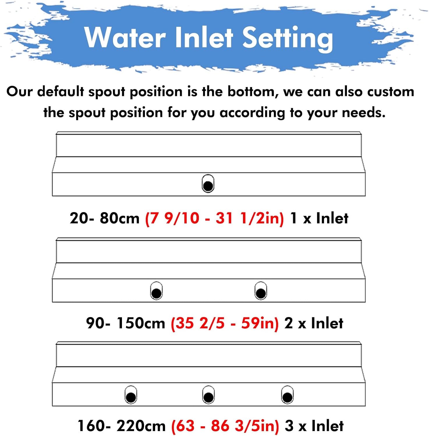 Enhance the beauty and tranquility of your outdoor space with our stainless steel waterfall spillway, designed to elevate any pool or patio water feature. This versatile overflow channel can be customized to your desired length, making it the perfect solution for various landscape designs. For a polished and integrated look, we recommend recessed installation, ensuring a seamless appearance that complements your outdoor oasis. **Specifications:** - **Product Name:** Waterfall Spillway - **Color Options:** Silver, Black, Bronze, Rose Gold, Champagne Gold - **Material:** Premium 304 Stainless Steel - **Custom Length:** Tailored to your specifications - **Width:** 12.5 cm (4.9 in) - **Height:** 10 cm (3.9 in) - **Recommended Mounting Height:** Up to 1.2 m (3.9 ft) **Key Features:** - Constructed from durable 304 stainless steel, ensuring resistance to rust and deformation for long-lasting use. - Sleek and simple design that complements various landscaping aesthetics, enhancing the overall ambiance of your outdoor environment. - Designed to work seamlessly with a water pump (not included), facilitating an elegant water flow. - Smooth surface ensures unobstructed water movement, creating a calming waterfall effect. - High impact resistance allows it to withstand strong water pressure, making it ideal for dynamic water features. - Default inlet position is at the bottom; alternative placements are available upon request. **Package Includes:** - 1 x Waterfall Spillway - 1 x PVC Connector - 1 x Sealing Tape - 1 x Soft Tube *Note: Water pumps and decorative items shown are not included.* **Precautions:** - Please allow for a size variance of 1-3 cm due to manual measurement. - Product images may vary slightly from the actual item due to lighting and resolution; the physical product is the final reference. Transform your outdoor space into a serene retreat with our stainless steel waterfall spillway, designed to deliver both functionality and style.
