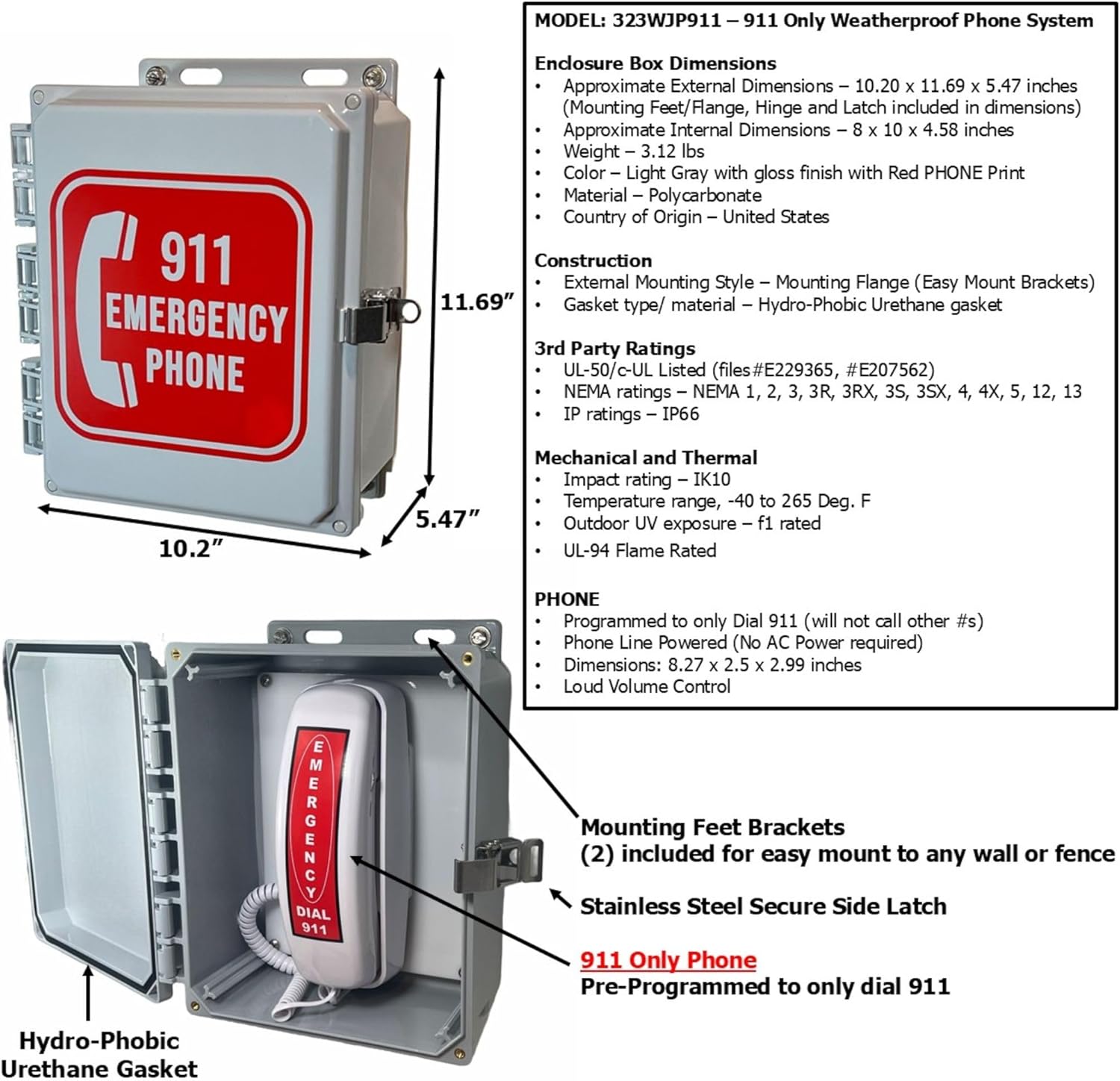 Total Package Includes: Weatherproof enclosure, latch (padlock capable door snap latch), phone wall jack/mount, internal mounting plate, emergency 911 label on the outside of the enclosure, internal mounting plate with 4 screws, programmed 911 Only trimeline phone. The weatherproof enclosure is anti-corrosive, fiberglass reinforced polyester with a secure side latch (padlock capable door snap latch). The enclosure has 4 external mounting holes and an internal mounting plate with 4 screws. Inside enclosure dimensions: H x W x D 10 x 8 x 5.59
