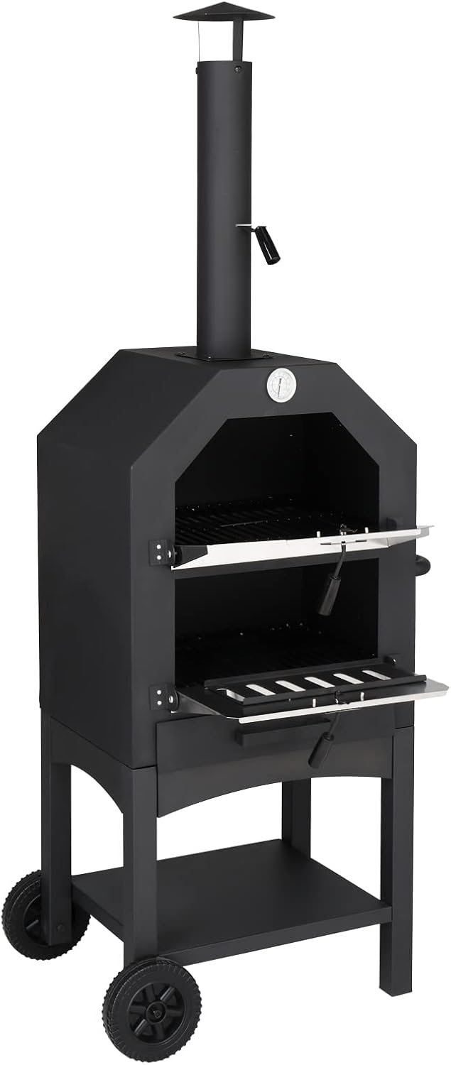 Specifications:1. Product Weight: 49.6 lbs / 22.5 kg 2. Product Dimensions: (26x22.4x62.2) in / (66 x 57 x 158) cm (L x W x H) 3. Bottom Layer Board: 16.3x14.6 in / 41.5x37 cm 4. Stainless Steel Door: 14.8x8.7 in / 37.5x22 cm (Thickness: 0.04 in / 1 mm) 5. Grill Rack: 13.6x9.6x0.2 in / 34.5x24.5x0.52 cm 6. Chimney: φ3.3x18.1x0.06 in / φ8.5x46x0.15 cm 7. Pizza Stone: 12x12x0.3 in / 30.5x30.5x0.7 cm 8. Aluminum Pizza Peel: 12.2x12.2x0.04 in / 31x31x0.1 cm 9. Wooden Pizza Peel Handle: φ1x13.8 in / φ2.5x35 cm 10. Drawer Inner Dimensions: 15.2x13.8x1.6 in / 38.5x35x4 cmIntroductions:Create the perfect outdoor cooking experience with this versatile Outdoor Wood Fired Pizza Oven. This compact and portable oven will transform your backyard, patio, or camping site into a gourmet pizzeria. Measuring 26x22.4x62.2 inches, it offers ample cooking space without taking up too much room. Complete with a pizza stone, pizza peel, grill rack, you'll have everything you need to whip up delicious wood-fired pizzas and more in no timeFeatures:- Temperature Control: Heats up in 10 minutes and reaches temperatures up to 550°F (287°C) for quick and even cooking.- Built-in Thermometer: Monitor the oven's temperature to ensure optimal cooking conditions for your pizza.- Mobility: Features 2 large wheels and a side handle for easy transportation and relocation.- Complete Set: Comes with a pizza stone, pizza peel, grill rack, and waterproof cover for a complete outdoor pizza making experience.- Versatile Use: Perfect for backyard gatherings, patio parties, and camping trips.Package Includes: 1 x Outdoor Wood Fired Pizza Oven 4 x Grill Racks 1 x Pizza Stone 1 x Pizza Peel