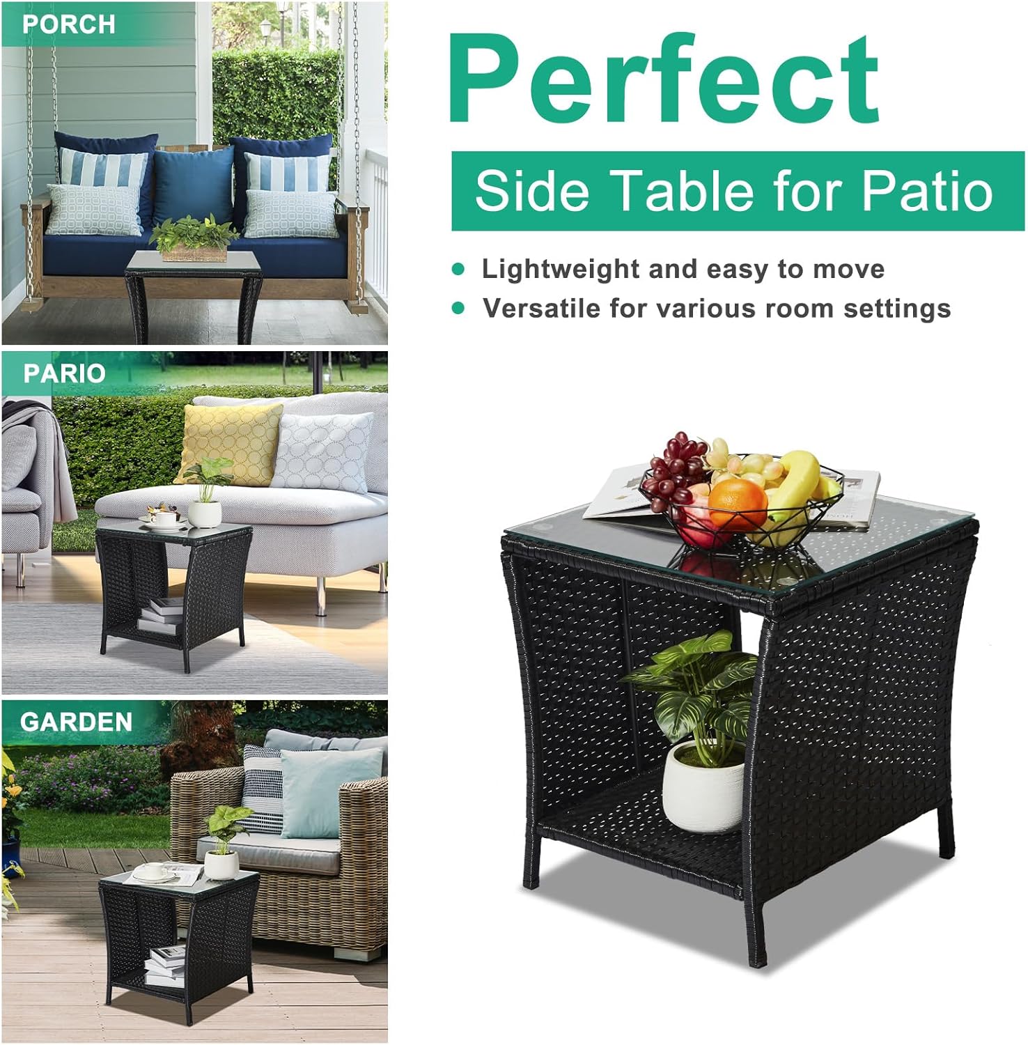 Introductions:Elevate your outdoor relaxation space with our Outdoor Patio Wicker Side Table. Boasting a robust combination of PE rattan and iron under a sleek tempered glass top, this square end table is the epitome of form meets function. Designed to complement any porch, garden, or backyard setting, this table merges durability with style. Its convenient under-table storage shelf is ideal for keeping magazines, towels, or snacks within reach as you enjoy the comfort of your outdoor haven.Features:1. Sturdy & Durable: Crafted with solid support legs and a robust structure, this table stands firm with a high load capacity of 110 lbs. The premium PE rattan material ensures all-weather resilience, making it ideal for any outdoor setting.2. Convenient Storage Shelf: The integrated shelf provides additional space for your reading materials, poolside essentials, or refreshments, keeping your outdoor area clutter-free.3. Glass Tabletop: Our tempered glass top not only enhances the table's aesthetic appeal but also promises easy cleaning.4. Universal Appeal: This side table's versatile design seamlessly adapts to any indoor or outdoor decor. Ideal for a variety of settings such as balconies, patios, backyards, gardens, cafes, and even beachside retreats, it's the perfect accent piece for any environment.5. Easy Assembly: Comes with high-quality hardware and a detailed instruction manual for quick, hassle-free installation.Specifications:1. Color: Black2. Material: PE Rattan, Iron, Tempered Glass3. Overall Size: (18.1 x 18.1 x 19.5)"(L x W x H)4. Storage Space Height: 15.4in5. Glass Size: (17.72 x 17.72)"(L x W x H)6. Load Bearing: 110 lbsPackage Includes:1 x Wicker Side Table1 x Tempered Glass Tabletop1 x English Assembly Instructions1 x Hardware Pack