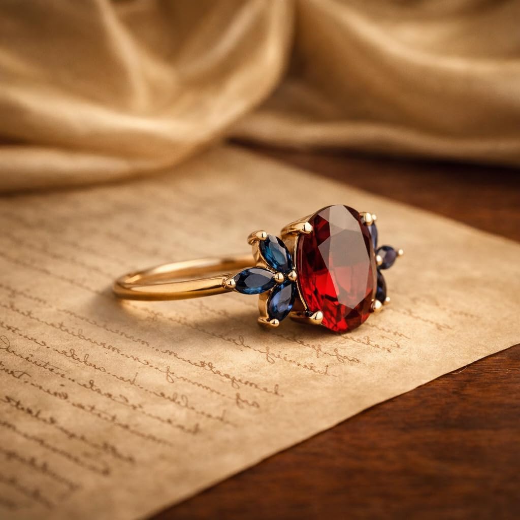 Inspired by blooming flowers, this elegant ruby and sapphire floral ring features a vivid oval ruby surrounded by marquise blue sapphire accents arranged like petals. The contrast of deep red and rich blue creates a striking yet balanced design that feels both romantic and regal. Handcrafted in solid 14K yellow gold, the setting enhances the gemstones’ color while providing durability and comfort for daily wear. The floral cluster silhouette offers a soft feminine appearance while still making a noticeable statement. Ideal as an engagement ring, anniversary gift, or meaningful jewelry piece, this ring represents love, beauty, and individuality. A timeless design meant to be treasured for years.