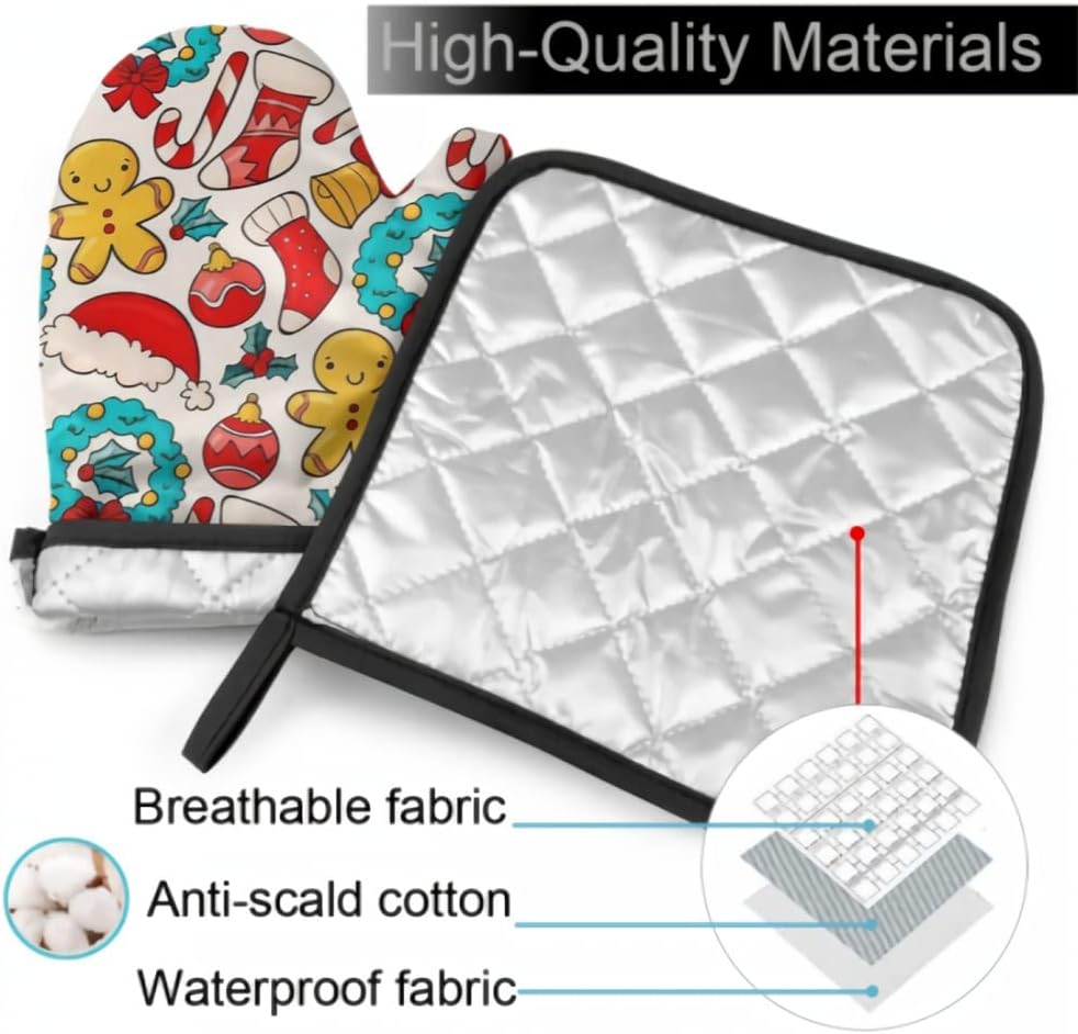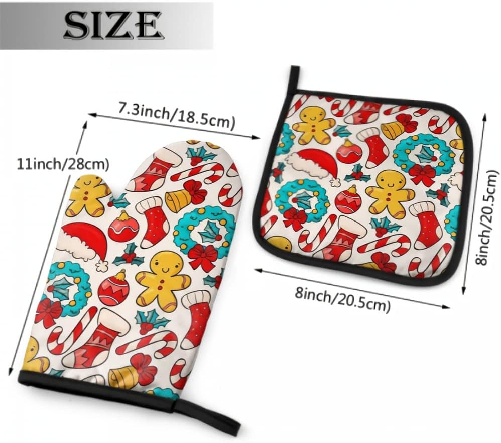 Features:Heat-Resistant, Wear-Resistant Oven GlovesThick Cotton Lining And Extremely High Heat Resistance, Can Safely Help You Work In The Kitchen. And Designed With An Updated Appearance And Powerful Functions. Each Oven Mitt Features A Cotton Loop Inside So They Can Be Hung In A Cabinet, Near The Grill Or In A Pantry.Allow Hand Washing,Don'T Machine Washing, Just Wash It With Warm Soapy Water And Dry It, Do Not Bleach.Material: Waterproof Polyester FabricSize: Approx 7.5 X 11 Inch Inch (Gloves) + 8 X 8 Inch (Pot Holder)Package includes:1 Oven Mitts 1 Potholders.Note:The size of the manual measurement may have some error, it is within the range of ±1 cm, the actual size shall be subject to the actual object.Due to different lighting and shooting conditions, the color of the image may differ from the actual product. Please refer to the actual product.
