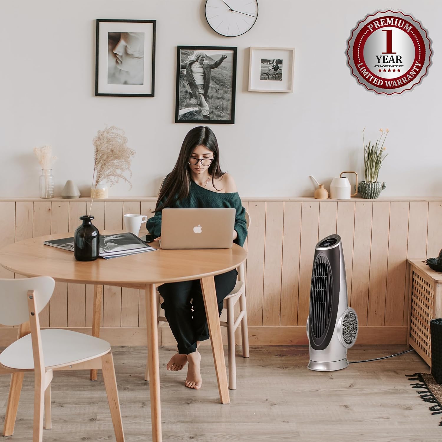 Relish the soothing breezes with the OVENTE Oscillating Tower Fan TF88S, an essential room fan for your bedroom that offers unparalleled power to keep you comfortable at all hours. This sturdy and bladeless stand fan integrates effortlessly into your home's aesthetic. Light enough to move with ease making it an ideal stand-up fan for bedrooms and large rooms. Unlike other oscillating indoor fans, this tower fan promises a complete 90 degrees oscillation without loud fan noises. The 3-speed settings offer a choice of gentle breezes to more powerful currents to suit all your needs. Comes with a user-friendly remote, featuring on/off, speed, oscillation and timer to gain complete control over your cooling experience. Includes an up to 8-hour timer that automatically shut-off which is very effective and useful for scheduled cooling and energy conservation. This quiet fan boasts low-noise technology which makes it perfect for a more peaceful environment, uninterrupted sleep or comfortable relaxation. Easy to clean, simply wipe the body of the fan with a soft cloth. The OVENTE 90° Oscillating Tower Fan is designed to blow fresher and cooler air, making it an invaluable addition to your home.