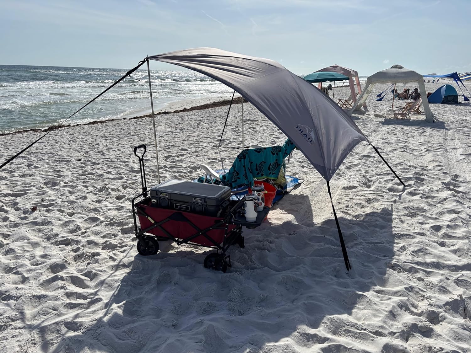 Transform any outdoor space into a comfortable retreat with the Overland Trail Topper Awning. This generous 8' x 7' portable shade solution is specifically designed for overlanding trailers, trucks, vans, Jeeps, Broncos, and RVs. Setup takes under 5 minutes, featuring universal fit with built-in suction cups for enhanced wind control. Crafted from durable 200D Polyester Ripstop Fabric with UPF 50+ protection and 1000mm waterproof rating, this awning keeps you sheltered in various conditions. The versatile design includes two height-adjustable 7ft poles, heavy-duty fiberglass supports, and a unique configuration where one side stakes to the ground while the other secures to your vehicle for maximum stability. Complete with four 12ft straps, tent stakes, a light hook, top vent, and a lightweight carrying bag weighing just 9lbs, this awning is the perfect companion for beaches, trails, campsites, and outdoor events.