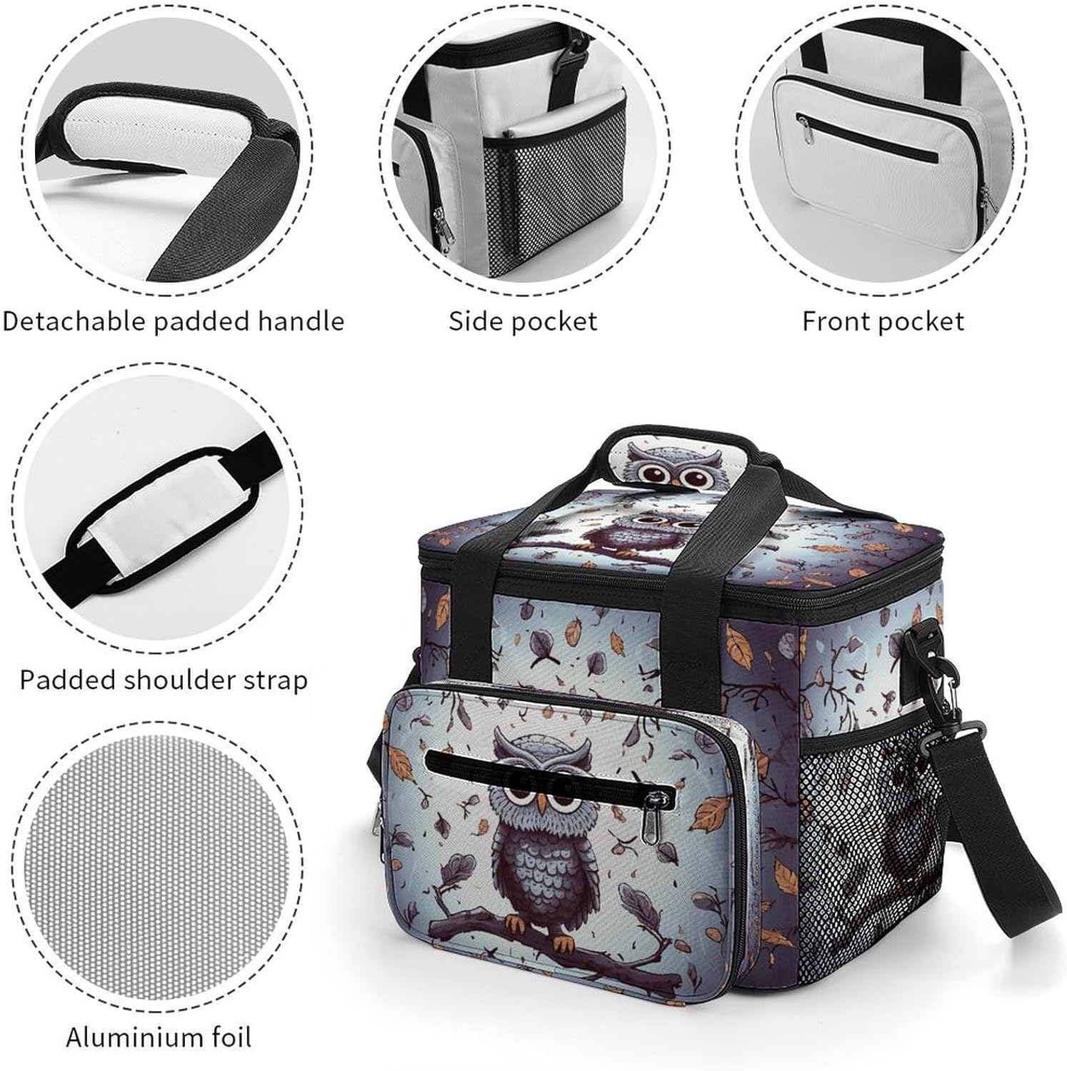 When you're looking for a reliable way to keep your food and drinks fresh while on the move, our Owl Tree Branches insulated cooler tote is the perfect solution. Made from high-density Oxford cloth with an upgraded aluminum foil lining, it offers superior insulation that maintains the temperature of your items for hours. The leakproof design ensures no messy spills, and the sturdy construction means it can handle the rigors of daily use, whether you're commuting to work or heading out for a weekend camping trip.The 22.5L large capacity provides ample space for all your essentials, from sandwiches and salads to cans of soda and bottles of water. The comfortable 66cm straps make it easy to carry, and the compact vertical design doesn't take up unnecessary space in your car or backpack. Whether you're packing a meal for the office, preparing for a family picnic, or stocking up on groceries, this cooler bag has you covered.Forget about flimsy coolers that fall apart after a few uses or fail to keep your food fresh. Our reusable cooler tote combines practicality, durability and style in one package. Its neutral design works for everyone, and its versatility makes it a must-have accessory for anyone with an active lifestyle. Invest in a cooler bag that meets all your needs and simplifies your on-the-go eating experience. Lightweight Cooler Bags Oxford Cloth Cooler Bags Ice Packs Reinforced Handle Ice Chest Cooler Bag Tote Cooler Bag Versatile Cooler Bags Portable Insulated Cooling Everyday Cooler