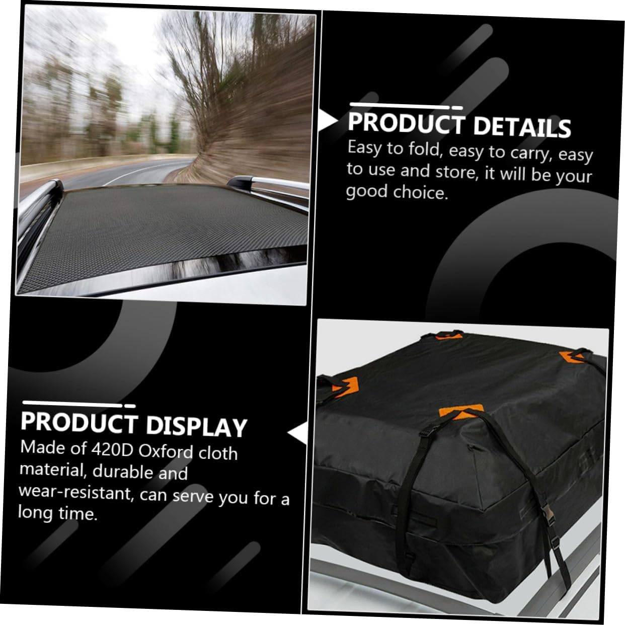 Package List 1 roof bag Characteristics -Color: Black vehicle roof bag. -Product Info:Waterproof luggage bag -Size: About 112.00X87.00X44.00cm/44.02X34.19X17.29inch car roof cargo carrier. -Material: 420D Oxford cloth car storage bags. -The structure is reasonable, easy to fix, stable and reliable, you can rest assured to use it for storage travel roof storage bag. -This roof bag has a large capacity and is large enough to hold most of the items you need weather-resistant car roof bag. -It is made of durable and practical 420D Oxford cloth material, which has a very good texture and will not be easily damaged roof rack cargo carrier. -It is made with superb craftsmanship, with simple design and practical functions, which can bring you of convenience waterproof car roof bag. -Waterproof and wear-resistant, it can protect your luggage from rain, gravel, snow, wind and the road car rooftop cargo carrier bag.Goods InformationCar Roof Cargo Holder Made of craftsmanship and 420D Oxford cloth material, it has excellent durability and practicality, waterproof and wear-resistant, safe and reliable, can store and protect your luggage, and will serve you well.roof cargo bag Are you looking for a professional, practical and roof luggage bag? Our products will be your good choice