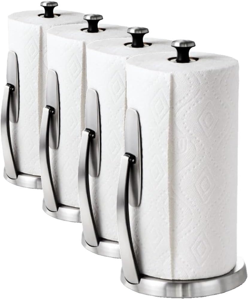 Commonly considered among new apartment must haves, the SimplyTear Paper Towel Holder has a spring-activated arm to hold the roll securely and allows for a one handed tear. No matter what brand or size paper towel roll you use, the arm automatically adjusts to the width of the roll. The stainless steel arm keeps the paper towel edge accessible at all times so you do not have to search for the edge. The SimplyTear Paper Towel Holder is designed with internal resistance to prevent the paper towel roll from unraveling. Loading the Paper Towel Holder is easy. The arm pivots away from the center pole and locks open, allowing you to slip the paper towel roll over the center pole without fuss. A weighted stainless steel base and non-slip ring keep the Paper Towel Holder in place. Made of brushed stainless steel with black plastic accents, OXO’s SimplyTear Paper Towel Holder is an elegant addition to any kitchen countertop.