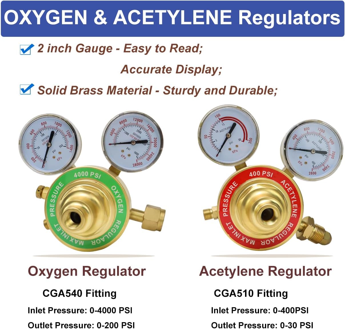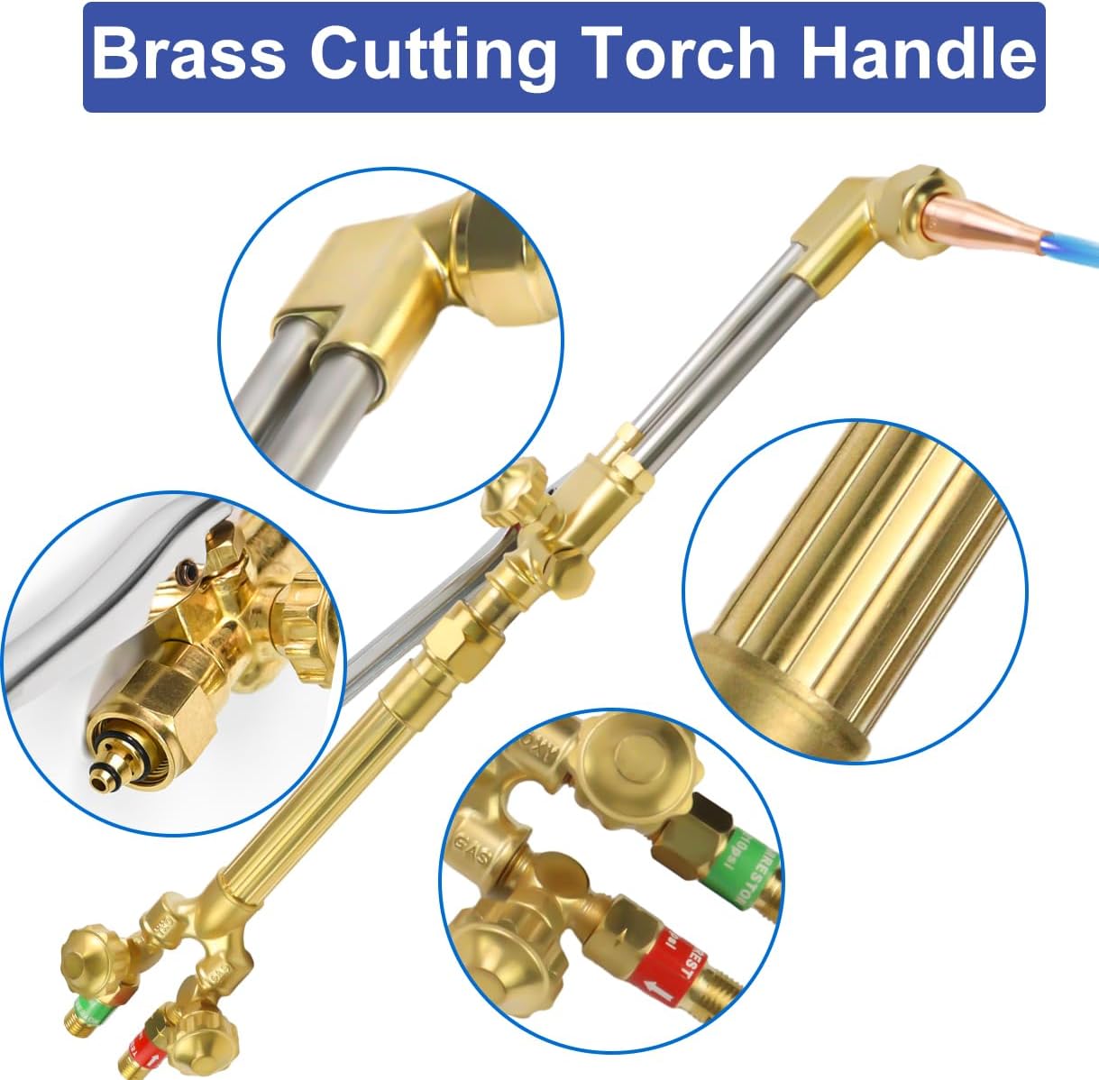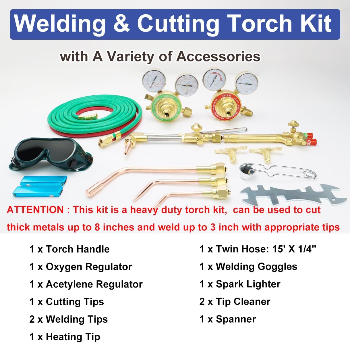 Transform your metalworking projects with this comprehensive oxy-acetylene torch kit. This professional-grade setup includes everything needed for precise cutting and heating operations: a versatile cutting torch with heating tip, oxygen and acetylene regulators for accurate gas control, a durable twin gas hose for reliable fuel delivery, and essential safety equipment including protective welding glasses and check valves. The robust construction and industry-standard fittings ensure reliable performance for both professional welders and serious DIY enthusiasts. The included regulators provide precise control over gas flow, while the check valves add an extra layer of safety to your welding operations. Perfect for metal cutting, heating, and welding applications across various materials and thicknesses. The kit's components are designed to work seamlessly together, offering you a complete solution for your metal fabrication needs. Heavy Duty Oxy Acetylene Torch Kit,this cutting torch kit is able to cut thick metals up to 8 inches and weld up to 3 inch with appropriate tips Upgraded Oxy Acetylene Torch Kit with Heating Tip,This gas welding and cutting kit comes complete with a torch handle, Oxy and Acetylene regulators, 1 heating tip, 1 cutting tip (#1-1-101), 2 welding nozzles (#1, #3), a 15FT x 1/4" twin hose, welding goggles, spark lighter, tip cleaner, spanner, and a convenient storage box for easy organization.Cutting Torch with Built-In Safety Features,The cutting torch handle is equipped with check valves and a built-in flashback arrestor and reverse flow check valve, ensuring safe operation, making it capable of cutting and welding thick metals.Heavy-duty Construction with Brass Fittings, Crafted from high-quality materials, this oxygen-acetylene torch set features stainless steel and brass welding and brazing tips, along with a 15ft x 1/4 inch twin gas welding hose that is flexible, kink-resistant, abrasion-resistant, and weather-resistant for long-lasting durability.Versatile Gas Welding Cutting Torch Kit,This comprehensive kit is suitable for a range of applications, including welding, cutting, soldering, and brazing, making it perfect for both professionals and DIYers who require a reliable and efficient tool kit.