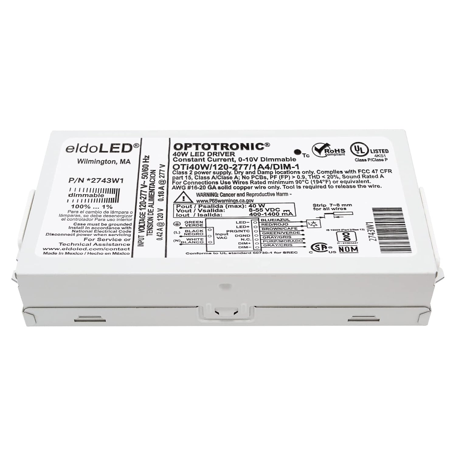 Replacement/Compatible with Osram 57351 eldoLED 40W Constant Current LED Driver – 2743W1 OPTOTRONIC, 0-10V Dimmable The eldoLED 2743W1 OPTOTRONIC LED Driver delivers reliable, programmable constant current performance with up to 40W of output power. Compact and powerful, it’s designed for advanced architectural and commercial lighting systems where space is tight and control is essential. 0-10V Dimmable LED Driver with Smooth Light ControlThis eldoLED 40W dimmable LED driver supports full-range 0-10V dimming down to 1%, ensuring flicker-free, smooth transitions. With DIM-to-OFF capability, it’s ideal for modern dimming systems that require precise brightness adjustment.Programmable Constant Current LED Power SupplyWith a wide programmable output range of 400–1400mA, this constant current LED driver can be tailored for a wide variety of LED modules and light levels. Programming is quick and easy with the 274A17 tool—no AC power connection required during setup.Product FeaturesType: Constant CurrentOutput Power: 40W (Max.)Programming Tool: *274A17 (51645)Programmable Features: Output currentSoft Start, Dim-to-offDimming levelLED thermal protectionConstant lumen outputEnd-of-life indicatorVaux (12/20/24V)Input Voltage (VAC): 120-277V (+/- 10%)Frequency Range (Hz): 50-60 Hz (+/- 5%)Output Current (mA): 400-1400mA (1mA Step), 700mA defaultOutput Voltage (VDC): 8-55VDCDimming Control: 0-10V (Isolated)Dimming Range: 1-100%Dimming Type: Current ReductionUL Environmental Rating: Dry and DampUL File Number: E320395Product Dimensions (L x W x H): 5.0" x 2.4" x 1.1"Product Weight: 8.1ozKey Features & BenefitsArchitectural-grade features include: True 1% dimmingSynchronized ON/OFF and dimming controlDIM to OFFDimming interface protectionCustom programmable with 1mA resolution to perfectly match LED load and maximize performanceIntegrated OEM programmable features include: Constant lumen maintenanceEnd-of-life indicationLED thermal protectionSoft startProgramming does not require powering up or connecting the power supply to AC line voltageAvailable optional auxiliary output to power 12V, 20V, and 24V low power applicationsFamiliar standard industry housing – 5.0" x 2.4" x 1.1" (L x W x H)Wide output current and voltage rangeAvailable with mounting feet (F-style) or PEM studs (J-style) to simplify installationUniversal Input Voltage 120-277Vac 50/60Hz347Vac 50/60HzUL Class 2 output for safe operationIdeal Applications for the eldoLED 40W LED DriverArchitectural and commercial LED lightingDownlights and recessed troffersIn-grade and wall wash fixturesOEM lighting systems requiring precise current control
