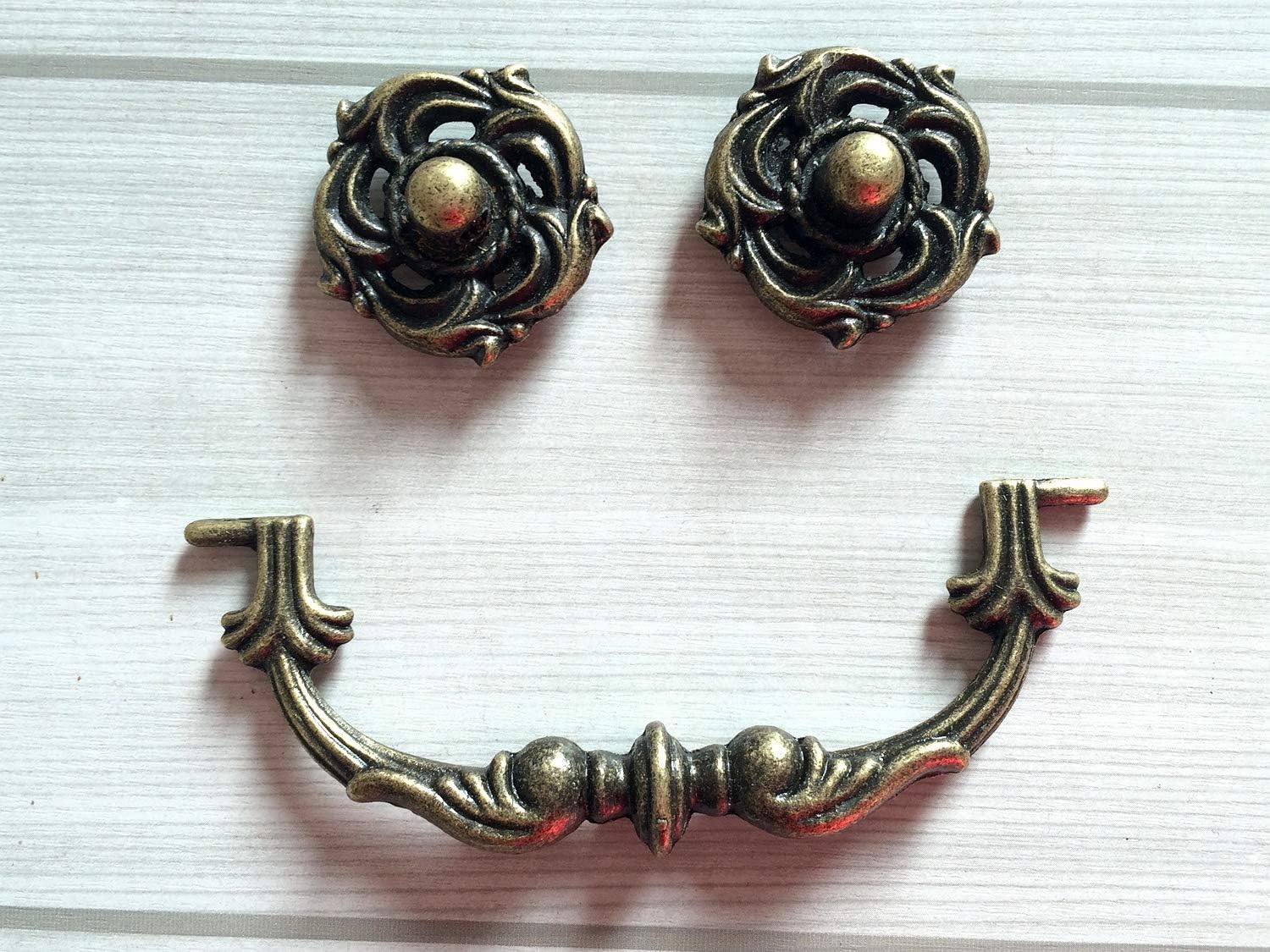 Pack of 4, 4.5" C-C (4-1/2 Inches Centers ) Bail Drawer Pull Drop Swing Handles Antique Bronze Vintage LookMeasurements: Length: 6" (153 mm)Width: 2.2" (55 mm) Diameter of rosettes: 1.6" (40 mm)Holes Center to Center: 4.5" (114 mm) When installed the knob sticks out 0.6" (15 mm) Mounting Screws included. M4. 4 mm Diameter. 1" (25 mm) long.Package Included: 4 Sets of Bail Drawer Pulls and 8 x 1" (25 mm) screws. Individually packed.