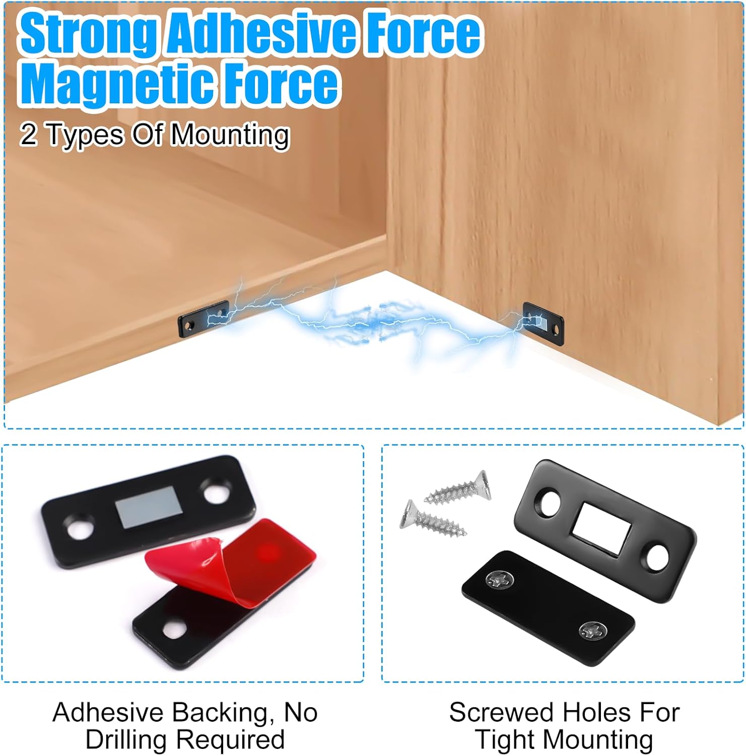 Specification: Product name: self-adhesive magnetic door closer Material: Stainless Steel; Magnet Colour: black. Size: 42 x 17.5 mm. Packing list: Self-adhesive magnetic door closer x 8. 16 x back adhesive. Screws x 32. Features: With this magnet for drawers, you no longer have to worry about children and pets opening and entering cupboards as desired, resulting in unnecessary trouble This magnetic closure cabinet has a strong magnetic attraction to keep cabinet doors, drawers, cupboards, etc. closed. There are 2 ways to install this magnet for doors: 1. Use the self-adhesive back to install it directly without damaging the furniture; 2. Use the traditional screws to install it, which are strong and not easy to loosen. You can choose your own installation method. Easy to install: you just need to clean the surface and keep it dry, tear off the adhesive layer and then stick the drawer magnet and press for 10-15S. If you choose the traditional screw installation, you need to use a tool to punch the holes in advance, and then tighten the screws. This magnetic closure door can be used in different scenarios, suitable for cabinets, sliding doors, windows, blinds, kitchen cabinets and all types of drawers that do not close tightly. Please note: Please do not hesitate to contact us for any product-related questions! Due to manual measurement, the size may have a slight error.