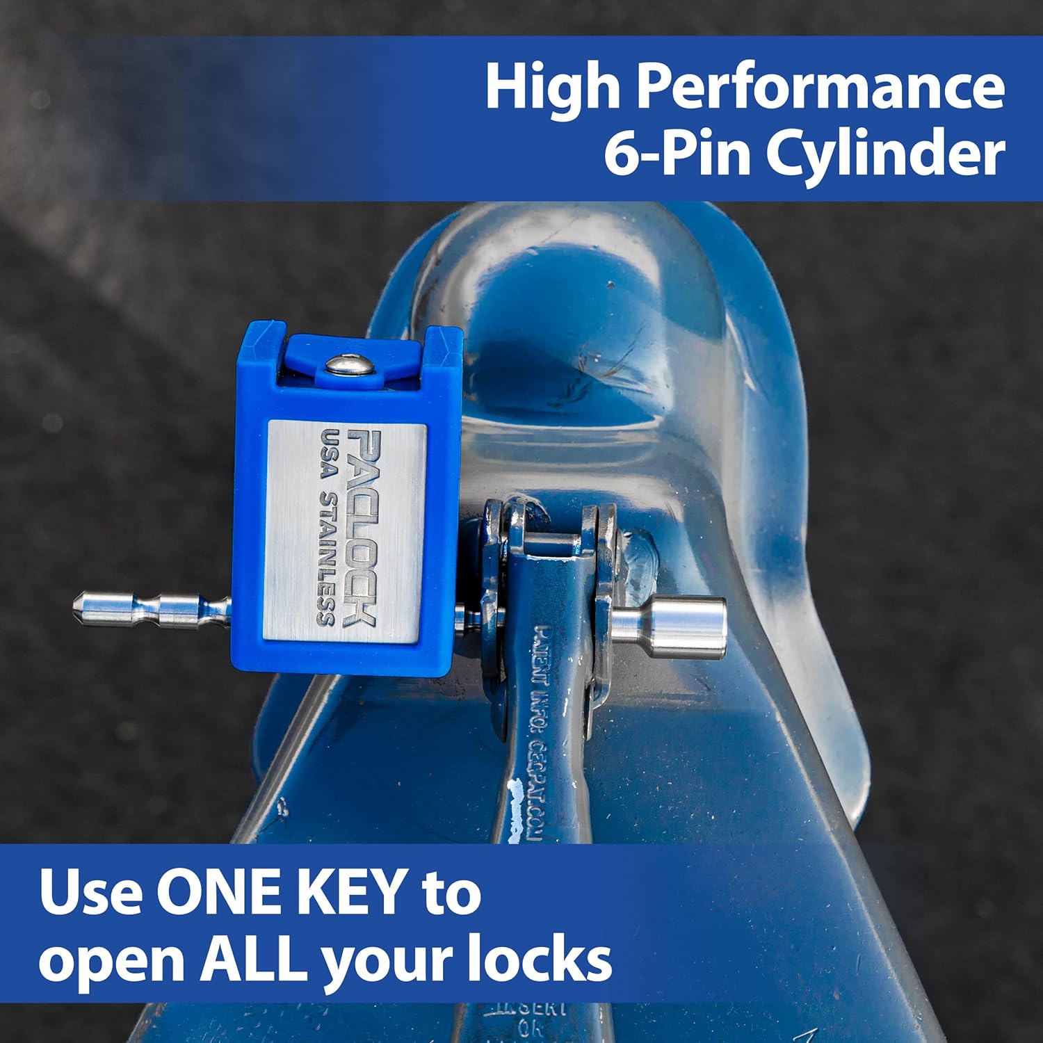 PACLOCK's 79-Series Universal Trailer Lock, UCS, Standard Pin, High Performance 6-Pin Cylinder, Keyed Differently w/ 2 Keys, Silver
