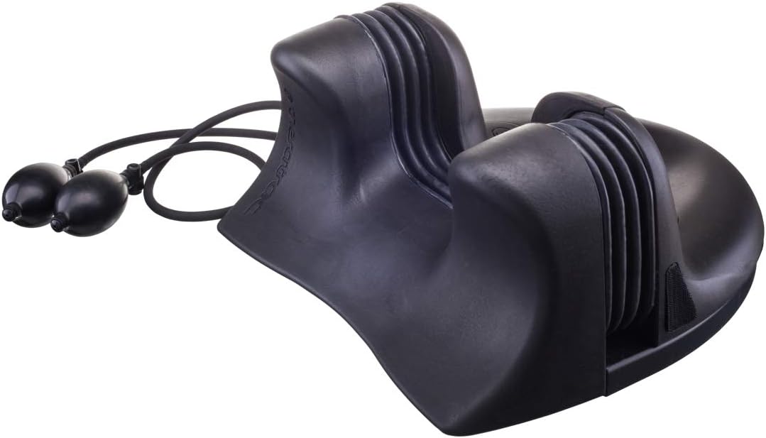 The Theratrac gently stretches neck muscles allowing the vertebral discs to realign, freeing the nerve root tissue from the pressure of the discs. The Theratrac helps "locked" neck muscles to slowly stretch and relax, allowing misaligned vertebrae to resume their normal supportive position. The Theratrac cradles the head and neck via a curvature in the neck portion of the device, as well as a special head rest section that is vertically pneumatic. Both the headrest and neck region, inflate with over 30 lbs of adjustable pneumatic pressure to create traction in the cervical curve. Small Model