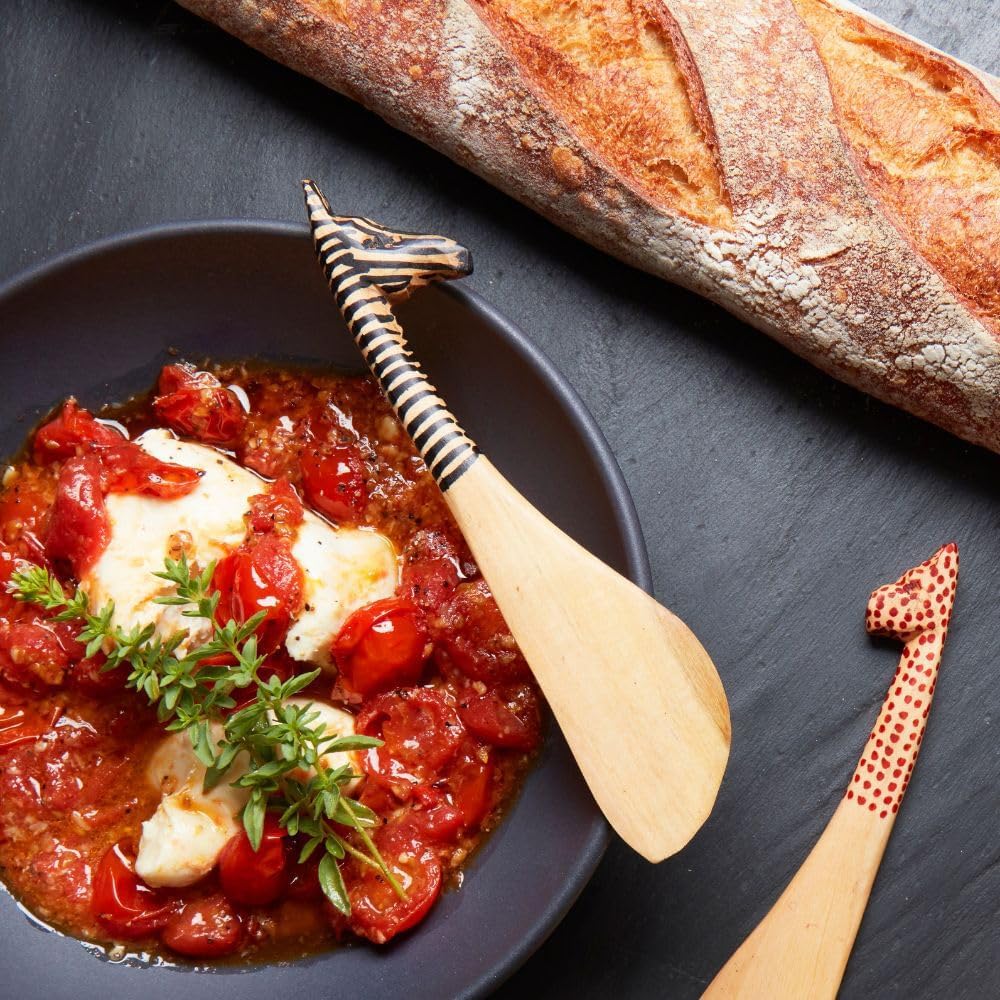 * Carved animal heads wooden spreaders* From our safari theme collection* Spreaders with giraffe, zebra, cheetah and elephant heads * Real-life detailing* For use with cheese, spreads, and honey* Handpainted in black, and brown colors* Made from jacaranda wood* 7" length, 1.5" width* Carved by the Kamba tribe* Sustainably produced* Made in Kenya---------------------------------Wood carving provides artisans in Africa with a sustainable source of income for their craftsmanship. We source products from wood workshops across Rwanda, Kenya and Ghana. In Kenya, wood carving is practiced by the Kamba tribe. Wood carving is a part of Kamba spirituality. They believe God, who they call Ngai, imparts shape to all living things. Carving is seen by the Kamba people as one of Ngai's creative efforts. Our products are primarily made from olive wood and jacaranda wood. You can browse through our collection of salad bowls, scoops, cooking spoons, cheeseboards, and home decor. Our favorites from the collection are hand-carved olive wood bowls. They are perfect for serving a dish or to use as a salad bowl. The skill and craftsmanship of the artisans can be seen in the smooth finish, natural grain, and carved details. All the products from the collection are ethically sourced.