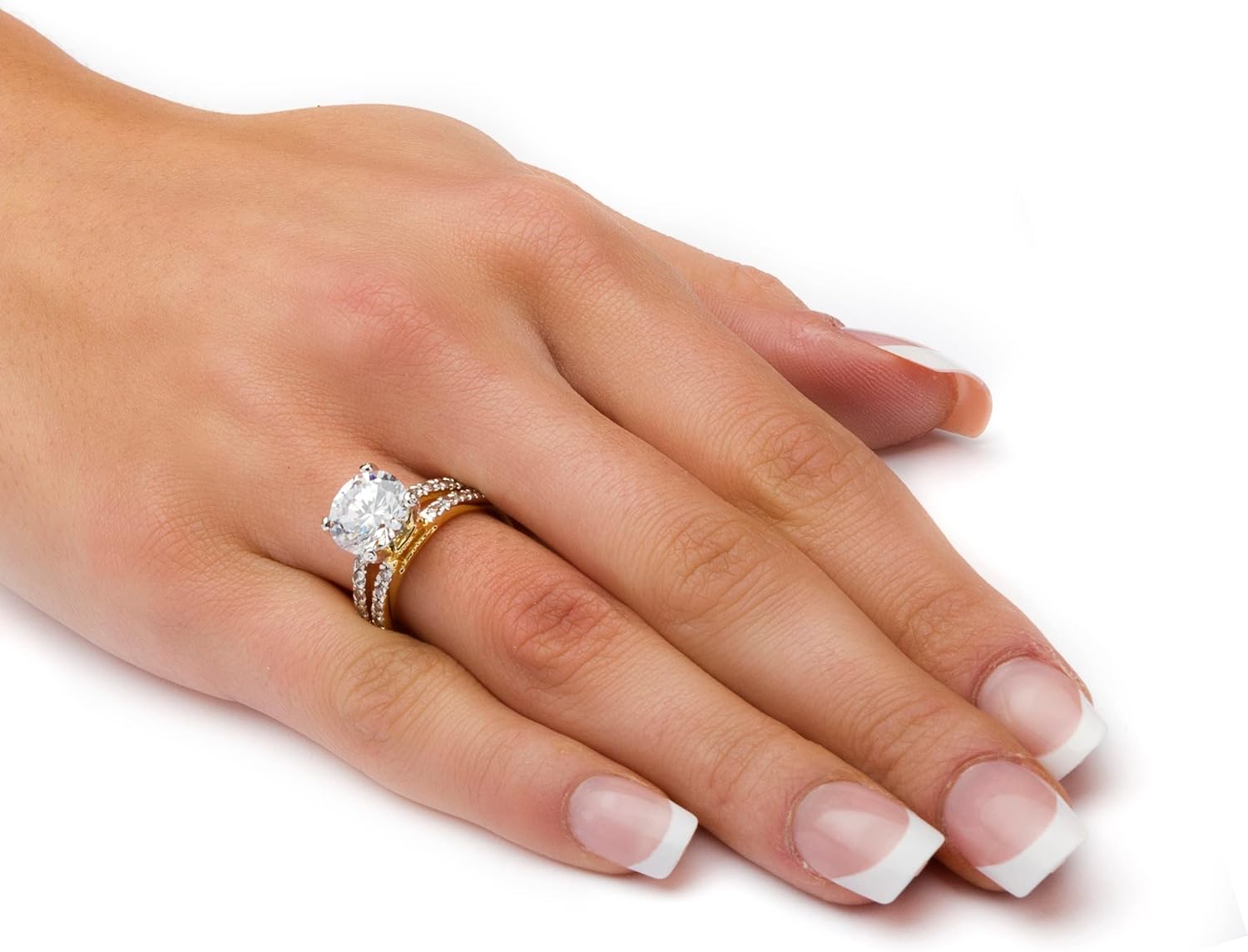 PalmBeach Jewelry exclusive. Contemporary yet classic, this round cubic zirconia ring is treated to a stunning combination of the round center stone accented with more shimmer from pave-set cubic zirconia accents. The split-shank setting is another element of beauty to the stunning accessory. It glistens and glimmers beautifully. 4.42 carats T.W. Two-tone. Gold-plated. Sizes 7-12. (All carat weights are approximate and may vary slightly from those listed.) - 50531