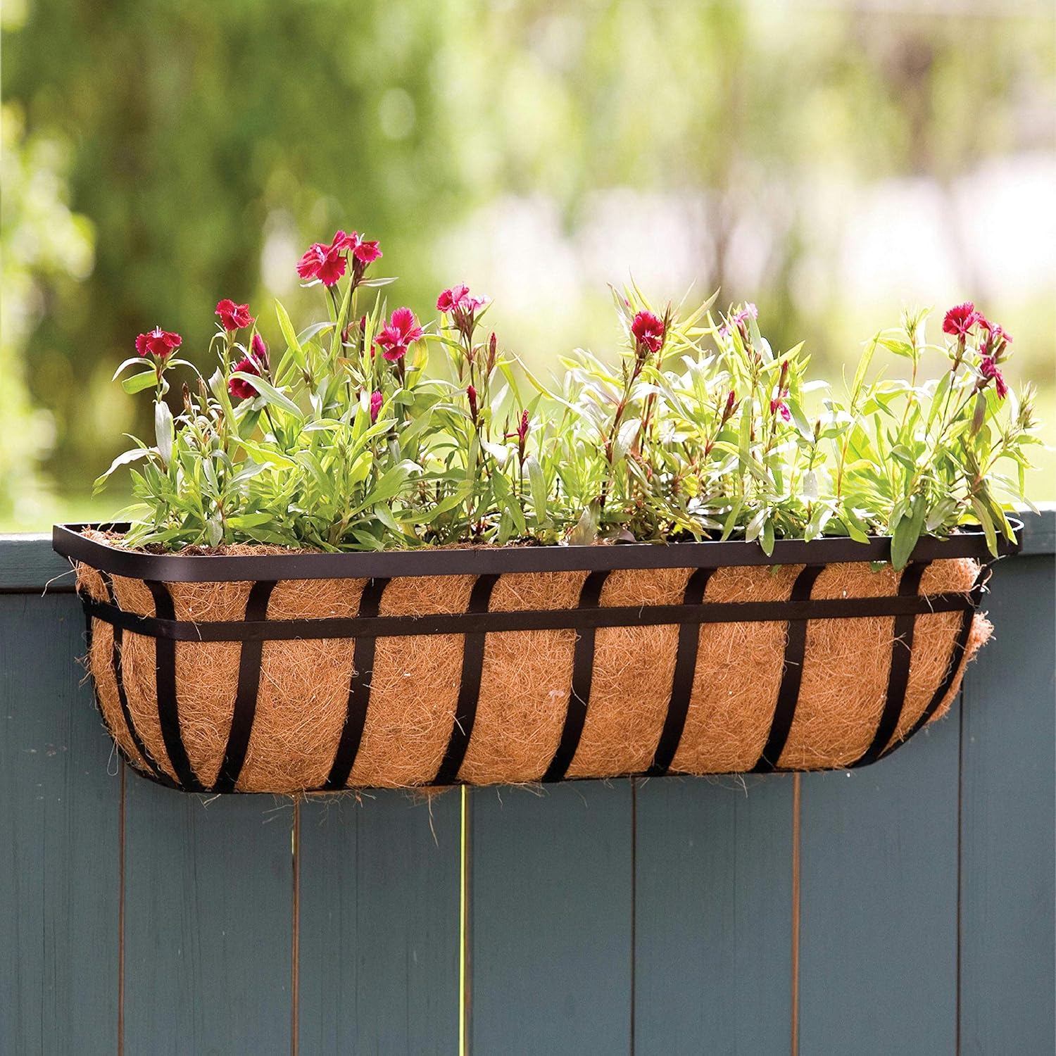 Bring timeless charm and practical functionality to your outdoor space with the Panacea 88558 Flat Iron Window and Deck Planter. Measuring 36 inches long, this planter box offers a generous growing area for herbs, flowers, or cascading greenery, transforming your deck, window, or garden wall into a lush showcase. Crafted from durable steel with a powder-coated black finish, the Flat Iron Planter is built to withstand outdoor elements while adding an elegant touch to your landscaping. Its flared lip and horizontal support band add visual interest and stability, blending classic style with sturdy construction. The included coco liner provides a natural growing bed, helping retain moisture while preventing soil messes on your deck or windowsill. With its versatile mounting options, the planter can be securely attached to a wooden 2x4 or 2x6 deck rail using the included hardware, wall-mounted via back keyholes, or placed freestanding on a flat surface. Perfect for flowers, herbs, or decorative greenery, the Panacea Flat Iron Window & Deck Planter delivers beauty, durability, and versatility in one stylish package.