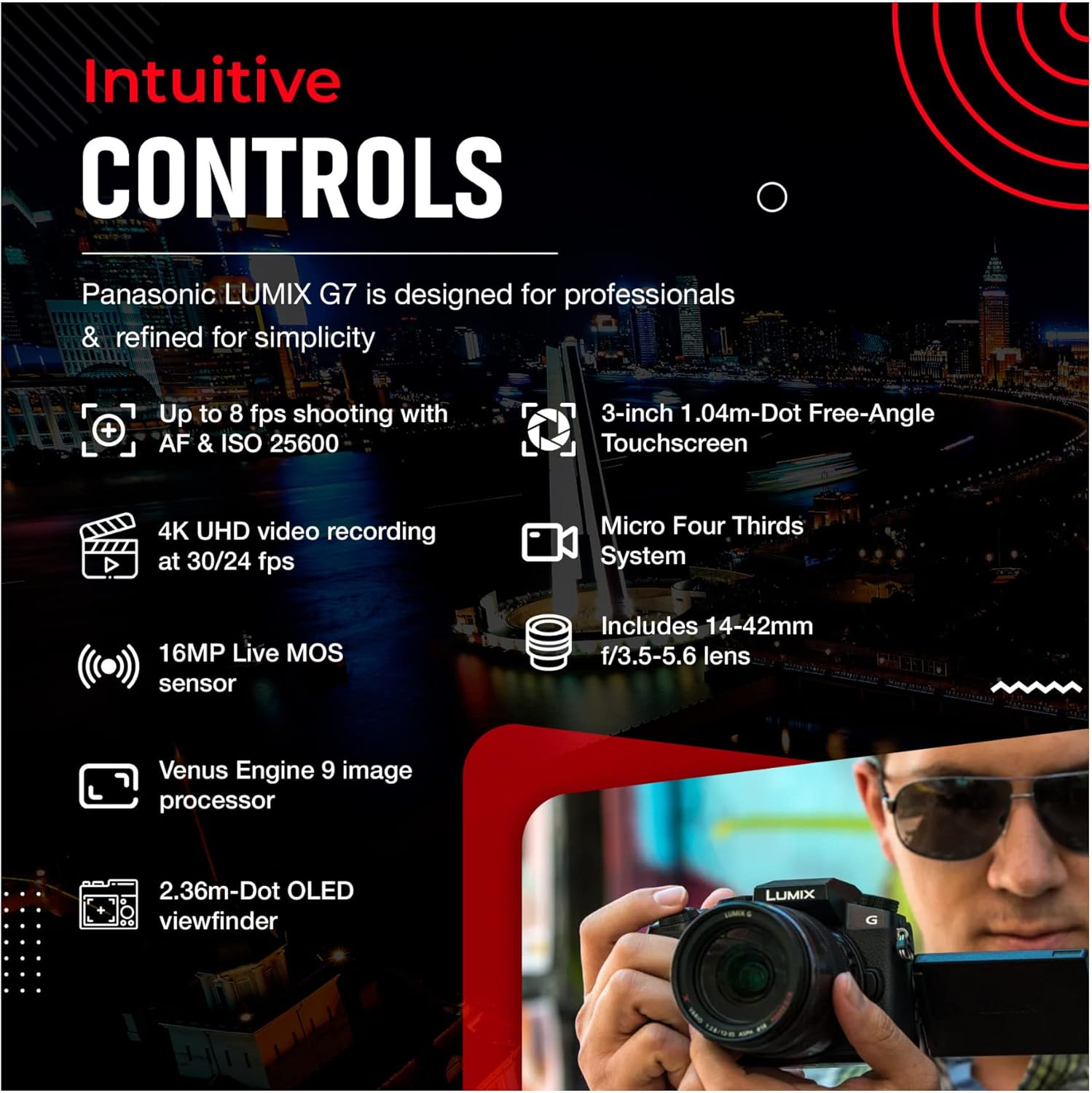Panasonic LUMIX G7 Mirrorless CameraThe Panasonic LUMIX G7’s 16MP sensor operates much like the larger sensors found in traditional DSLR cameras. The camera, however, also features an intelligent image processor that produces video and photos free from artifacts that degrade image quality. Its mirrorless design enables a lighter, more compact camera body, while also offering cutting-edge video, audio, creative controls, wireless, intelligent-focusing, and exposure technologies not possible with traditional DSLRs. You can even capture stunning, high-quality images in low-light conditions up to an amazing ISO 25,600.4K PHOTO Function Modes4K PHOTO Function includes three different modes—4K Burst, 4K Burst S/S (Start/Stop), and 4K Pre-Burst mode—all leveraging the camera’s 30 fps video capture rate. These modes allow you to capture or extract high-resolution 8MP photos from a 4K Ultra HD video.High-Visibility View FinderA high-resolution OLED Live View Finder features 10,000:1 contrast and perfect framing, so you’ll enjoy high visibility even under direct sunlight. Plus, the tilt/swivel touch-display lets you further adjust the screen for optimum clarity.High Speed Auto-Focusing with Depth-From-Defocus (DFD) TechnologyThe LUMIX G7 utilizes Panasonic’s exclusive DFD Auto Focus technology which instantly calculates the distance to subjects, then quickly adjusts the focus.Bundle Includes:Panasonic LUMIX G7 Mirrorless Camera with 14-42mm f/3.5-5.6 Lens (Black)Shotgun Video Microphone Professional On Camera MicSling Camera Bag1500mAh Replacement Battery for Panasonic BLC1264GB Extreme Pro SDXC UHS-I Memory CardFlexible 10-Inch Spider Tripod