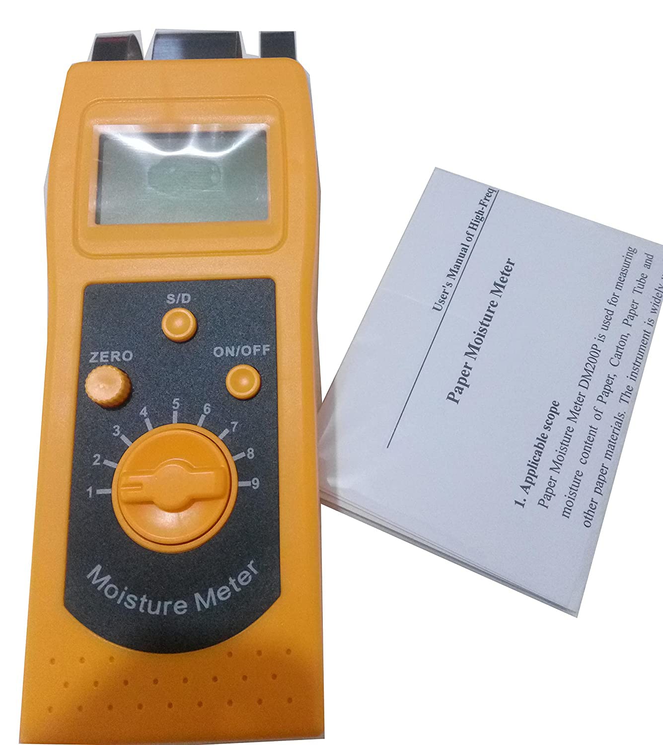 DM200 Paper moisture meter is a high-performance and digital moisture testing equipment firstly launched in our country by our company based on introduction of foreign advanced technology.The instrument adopts high frequency principle,digital display, sensors and main body together as one, equipped with ten gear is used to measure different kinds of papers, This moisture meter have high precision measuring instruments, and the small size,light weight,portable on-site testing. Timber industry testing of water in the production process of the ideal instrument. Technical Specifications *Display:4 digital LCD *Measuring range:0~2%/0~50% *Operating conditions: Temperature:0~60℃ ; Humidity:5%~90% *Resolusion:0.1/0.01 *Accuracy: ± 0.5%n *Power supply:9V battery (6F22) (Battery not included in the package) *Dimensions:160mm×60mm×25mm *Weight:203g (not including batteries)