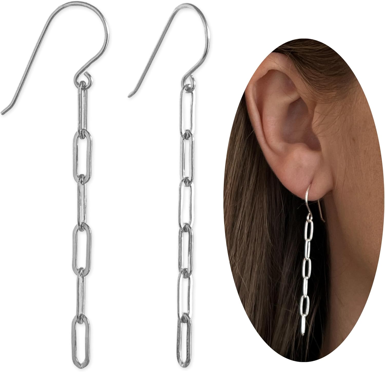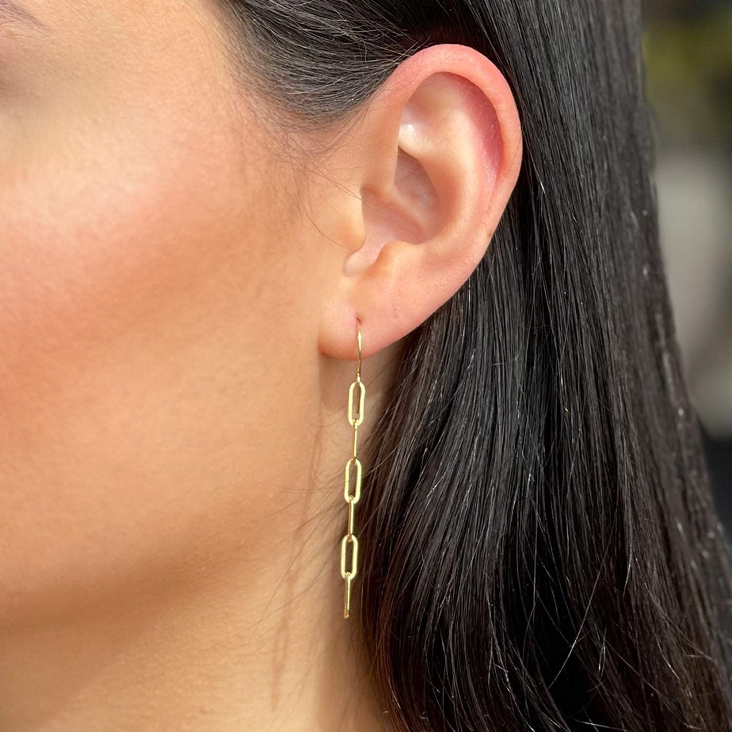 Beautiful and super trendy these paperclip or long rectangle chain earrings measure a drop of about 2 inches.This pair of earrings is available in 14k gold filled or 925 sterling silver.Each of the ear wires is handmade and has an extra large loop at the top.The perfect gift for any woman or teen.Your new earrings will arrive in a complimentary gift box ready for gifting.