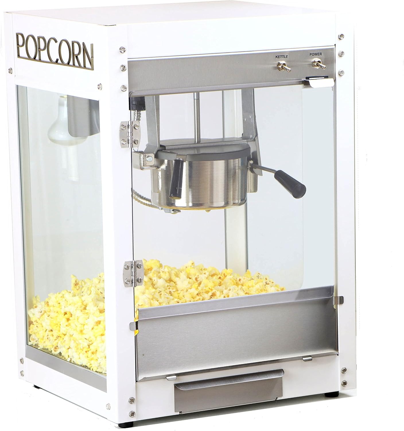 Paragon's streamlined Modpop Popcorn machines have a modern look well suited for many businesses, clubs, bars and homes. The gloss white cabinet has clean, bold graphics, smoked glass side panels and a clear door. These full-featured machines are easy to use and easy to maintain. Each full-featured machine pops delicious, theater-quality popcorn in 3-5 minutes. This popcorn machine creates 92 one ounce servings per hour for maximum output, and its spring-assisted kettle makes it easy to unload popcorn when it's done cooking. Its two-switch operation lets you effortlessly operate the machine. The aerated warming deck keeps your food warm while catching kernels and smaller bits for easy cleaning.