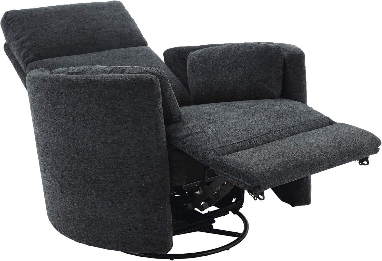 Relax and refresh in blissful comfort with this power recliner that also swivels. Crafted with a metal frame, it features a plush design with curved arms. It's wrapped in 100% polyester fabric. Plus, there's an integrated USB port that lets you keep your charging devices close at hand. Plus, it rests on a wagon-wheel base that lets you rotate 240° so that you can turn your attention to anything in the room without leaving your seat. What's more, the push of a button extends the footrest so you can lounge.Features:- Crafted with metal frame and wrapped in 100% polyester fabric- Integrated USB charger and patent-pending Parker Switch technology to manage power draw- Sumptuously soft chenille fabric cover is effortlessly elegant- 100% Luxury high density foam cushions wrapped in fiber- A 240-degree swivel feature makes it easy to see and hear everything- Wagon-wheel base and curved arms- Glider function enables soothing rocking motion- Chaise-style footrest provides continuous leg support- Luxurious foam (1.8- to 2.2-density) provides plush cushioning- Fully padded, foam-wrapped hardwood frame adds strength and durability- Removable back for easy transport and positioning in small spaces- Battery-ready design ensures easy cordless operation with FreeMotion cordless battery pack- Convenietly located intelliswitch hides inside the arm and provides easy USB power for devies without power draw- 350 LB weight limit- Includes 2 comfort pillows for additional support- Pillows are packed underneath the chair- Can be placed anywhere in the room (without proximity to and outlet) with the addition of a FreeMotion cordless battery packSpecifications:- Color/Finish: Mediterranean- Material: 100% Polyester (W)- Style: Contemporary- Product Dimensions: 41"W x 38"D x 41"H- Product Width: 41"- Product Height: 41"- Product Weight: 119.5lbs.- Weight Capacity: 360lbs.- Seat Dimensions: 23"W x 22.75"D x 20"H- Back Dimensions: 23.5"W x 24.5"H- Adjustability: Power Reclining- Commercial/Residential: Residential- Assembly Required: Yes