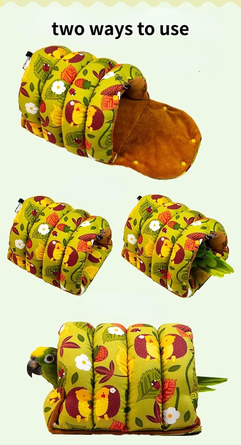 Product Material: High-quality rocker fleece, cotton Size: There are 4 sizes in available about the parrot sleeping bed. Please choose a suitable size based on the cage size and bird shape. Size S: 16x15x14cm/6.3x5.9x5.5inch, suitable for lovebird, budgie, conure, peony parrot, etc. Size M: 20x18x16cm/7.9x7.1x6.3inch, suitable for green-cheeked conure, 2 budgies, 2 lovebirds, etc. Size L: 23x20x17cm/9x7.9x6.7inch, suitable for cockatiel, parakeet, sun parrot, monk parrot, Senegal, Caique, etc. SIze XL: 29x23x21cm/11.x9x8.3inch, suitable for african gray, Eclectus, etc. Product features: Warm and cozy, safe, non-toxic, chewable and waterproof and breathable, and does not hang parrot excrement. Package Including: 1× parrot warm hut, 1 x free cotton cushion (easy to clean)