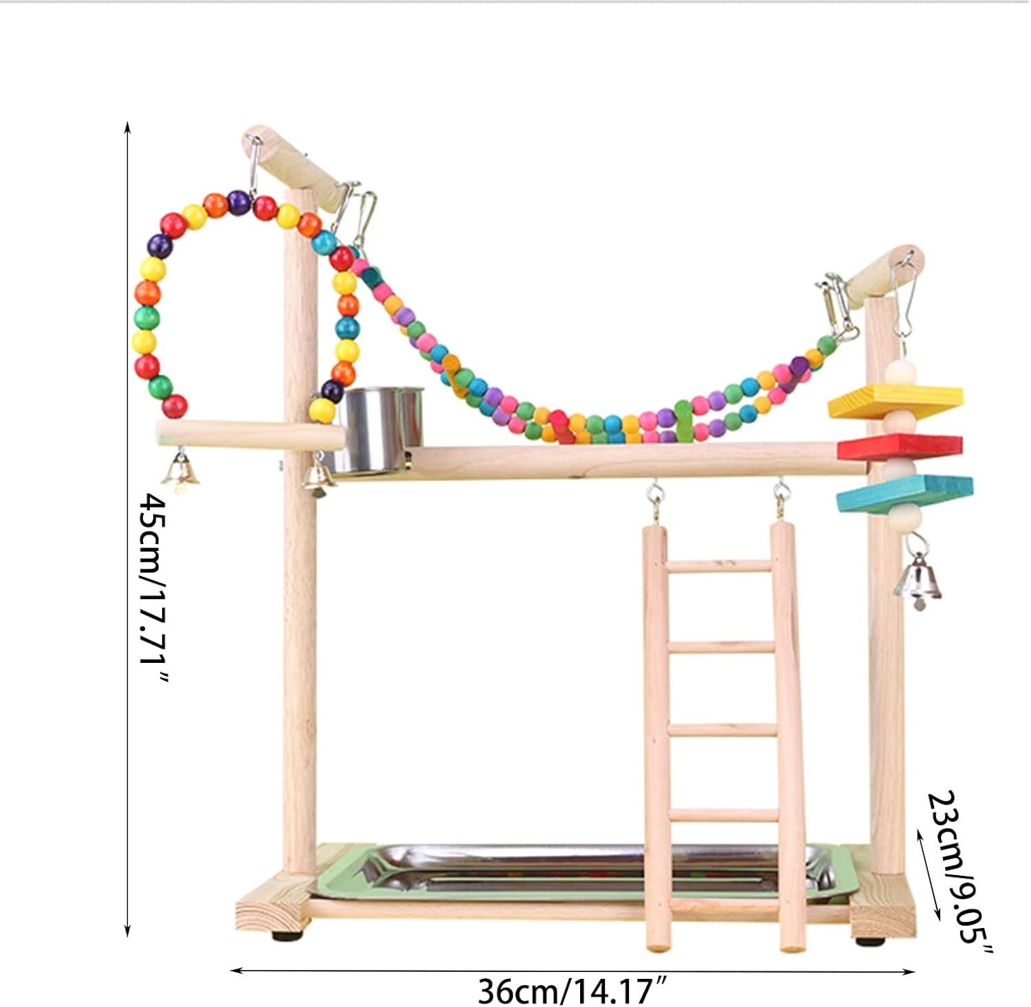 Parrots Cage Ladder Swing Colorful Beads Feeding Bowl Standing Supplies Bridge Training Parrots Standing SuppliesFeatures:Are you still worried that your bird will get bored- at home-?? -This is what your little furry friend want--Pet Bird Funfair!Small and Birds Toy Set. Suitable for parakeets, parrots, cockatiel, budgies, Upgrade-version With a tray and 2 feeding cups.Wooden branch helps exercise bird feet. Wide space between branches- allows bird comfortable relax place.Parrots stand perch provides excellent foot exercise. It gives your bird comfortable controlled grip massages your bird feet.Specifications:WoodSize: Approx.36x23x45cm/14.17x9.06x17.71inchPackage Includes:1 Set Bird Swing ToyNote:1.Please allow 1-2cm errors due to manual measurement, make sure that you do not mind before you order. 2.Due to the difference between different monitors, the picture may not reflect the actual color of the item.