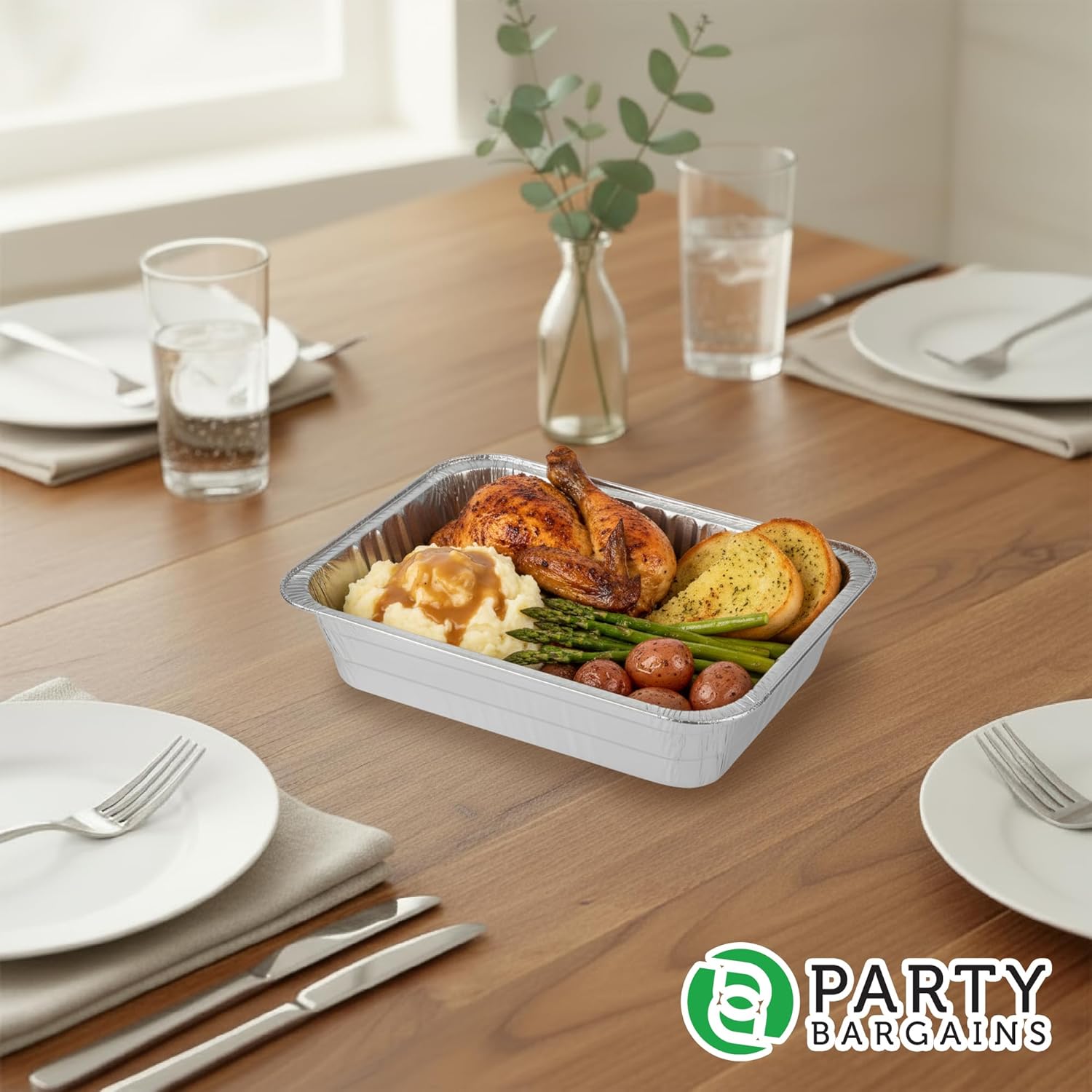 Party Bargains Aluminum Foil Pans provide the perfect solution for a wide variety of cooking, serving, and storage needs. Each pan measures 9” x 6” x 2”, offering ample room for generous servings. Crafted from durable, premium aluminum, these disposable pans are sturdy enough to handle a range of temperatures and cooking methods, making them ideal for baking, roasting, broiling, and more. With this 50-pack, you’ll have plenty on hand for catering, buffets, picnics, or meal prep. The even heat distribution of these pans helps prevent uneven cooking, making them a reliable choice for professional and home kitchens alike. Their convenient, disposable design means no time wasted on cleanup—just use and discard, or, if preferred, these pans can be rinsed and reused for multiple meals. Perfect for takeouts, they are also lightweight and portable, so you can easily carry them to events, family gatherings, or outdoor get-togethers. Great for any food business or personal event, these versatile pans provide high quality at a great value. Whether preparing meals for a big celebration or simply making everyday cooking easier, Party Bargains Aluminum Foil Pans are your go-to solution for reliable, convenient cookware.