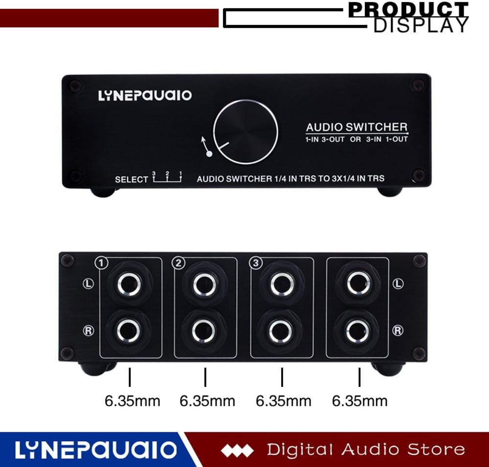 Product parameters Application of manual 3-level switching between multi-function and multi-equipment. 1 input-3-output or 3-input-1-output operations to achieve maximum versatility. Noise-free switching, fast and simple operation when connecting to put in use. One signal input, manually switch three signal output, In contrast, one signal output, manually switching three signal inputs. The product provides 1/4 Tip-Ring-Sleeve(TRS) 6.35mm socket for easy connection. The product does not need external power supply, aluminum shell is sturdy and durable. The frequency response is 10 Hz to 50 kHz. Net product weight: 336g. Weight after packing: 456g. Product size: length 143mm X width 79 mm X height 45mm. Packing size: length 200 mm X width 180mm X height 55mm. Packing list 1 X 1 input and 3 output or 3 input and 1 output passive stereo loudspeaker audio exchanger comparator.
