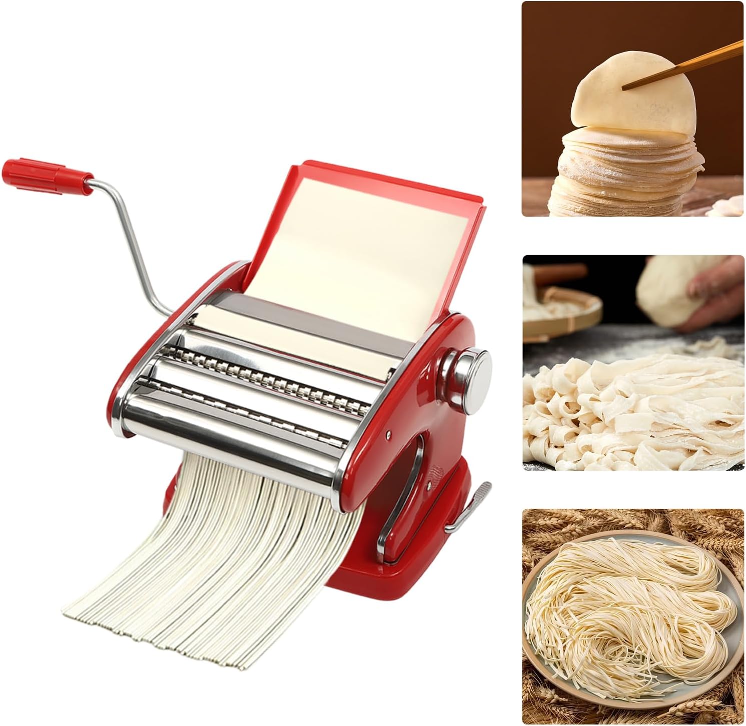 SpecificationMaterial: 401 Stainless Steel, Cold-rolled Steel, Color Steel Plate, RubberOperation Mode: ManualProcess: Electroplating, PaintingAdjustable Thickness: 0.3-5mm/0.01-0.20inchWidth of the Noodles: 2.4 mm/0.09 inch, 4.5 mm/0.18inch, 8 mm/0.31inchProduct Size: 20*15*22cm/7.87*5.90*8.66inchGross Weight: 4kg/8.82lbsNet Weight: 3.5kg/7.72lbsPackage Included1*Pasta Maker Machine1*English Instruction ManualDescriptionHandmade fresh food will bring more joy and satisfaction to you, your family, and your friends. This pasta maker machine is made of high-quality materials, which are strong, durable, safe, and non-toxic. It has three blades and six adjustable thicknesses to meet your different noodle preferences.Details Fixed Rod: It allows for easy and quick operation, which can improve efficiency. Adjustable Clamp: It allows you to quickly and firmly fix the machine on the desktop up to 2.36 inches thick.Ergonomic Handle: It gives you a comfortable touch and makes pasta-making effortless.Baffle: It makes the production process of noodles easier and can also serve as a dust cover. The smooth surface better care for your skin.ApplicationIt is a good helper in the kitchen for making spaghetti, fettuccine, lasagna, dumpling wrappers, etc. It can be used in home, small restaurants, outdoor camping, travel, etc. It is suitable for glass countertops, marble countertops, ceramic tile countertops, and solid wood countertops.NotesPlease read the operating manual completely before use. And pay particular attention to the safety instructions included. When adjusting the thickness, please ensure that the screws are aligned with the card holes of each thickness to ensure that they are securely inserted into holes to avoid damaging the machine. You can also put a little vegetable oil(not included) on the parts that often need to be turned to ensure lubrication.After use, please wipe the machine with a dry cloth or brush to clean the remaining flour and store it in a cool and dry place. Washing is not recommended.Please allow the slight color difference caused by the shooting light and 1-3cm error due to manual measurement. Please make sure you do not mind before you order.