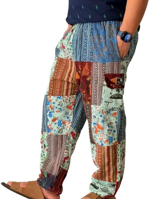 ZILLION CRAFT HIPPIE TROUSER This unique classic hippie trouser is made from natural gheri cotton from himlaya . Its hand made from vintage loom with mushroom patch print. It has multiple 5 pockets with wooden button on side pockets. As this loose fit baggy trouser has elastic waist with drawstring and elastic hem at bottom for easy wear. As this is hand made item so patchwork pattern may slightly different from picture shown above. Note: For first wash we recomend to do hand wash due to color concentration due to print color and after that its fine with machine wash.