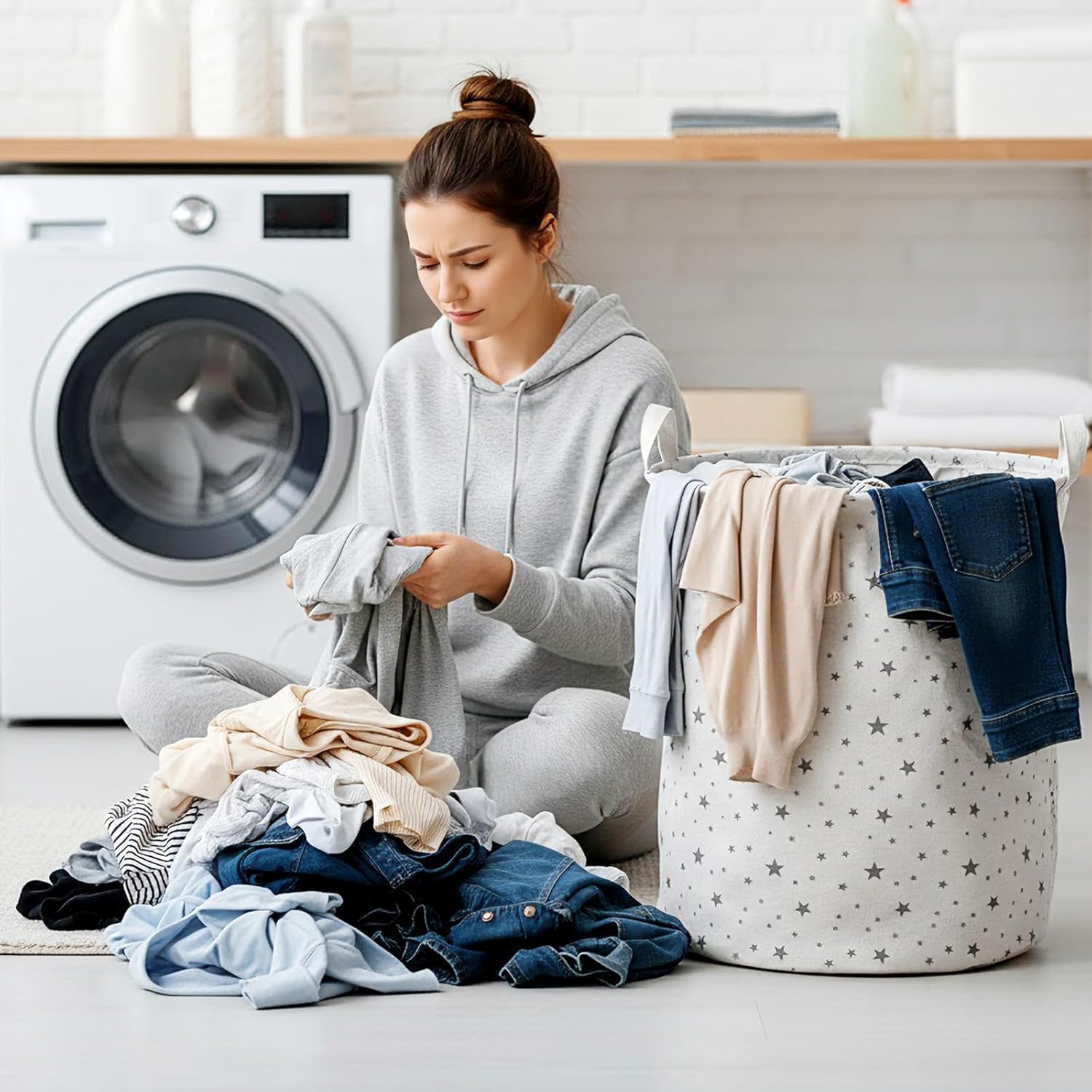 Features: Multi-functional: It can be applied as a laundry basket to store dirty clothes, or placed in the children's room to store toys, books and other sundries, keep the house clean and tidy, suitable for hamper in a nursery, home, office, closet organizer, playroom, kitchen bedroom, bathroom, college dorm, craft room, etc. Large Capacity & Foldable: The basket equip with PU leather handles, lightweight and portable, easy to move, large capacity, can hold an entire family's clothes, adopted collapsible design, you can fold them up when you don't use it. Specifications: Material: linen fabric, PE and PU leather handle, with Waterproof PE Coating Lining Size: 19.7 inch (height) x 15.7 inch (diameter) Package includes: 3 x Storage baskets Notes: Manual measurement, please allow slight errors in size. The colors may have a slight difference due to different screens