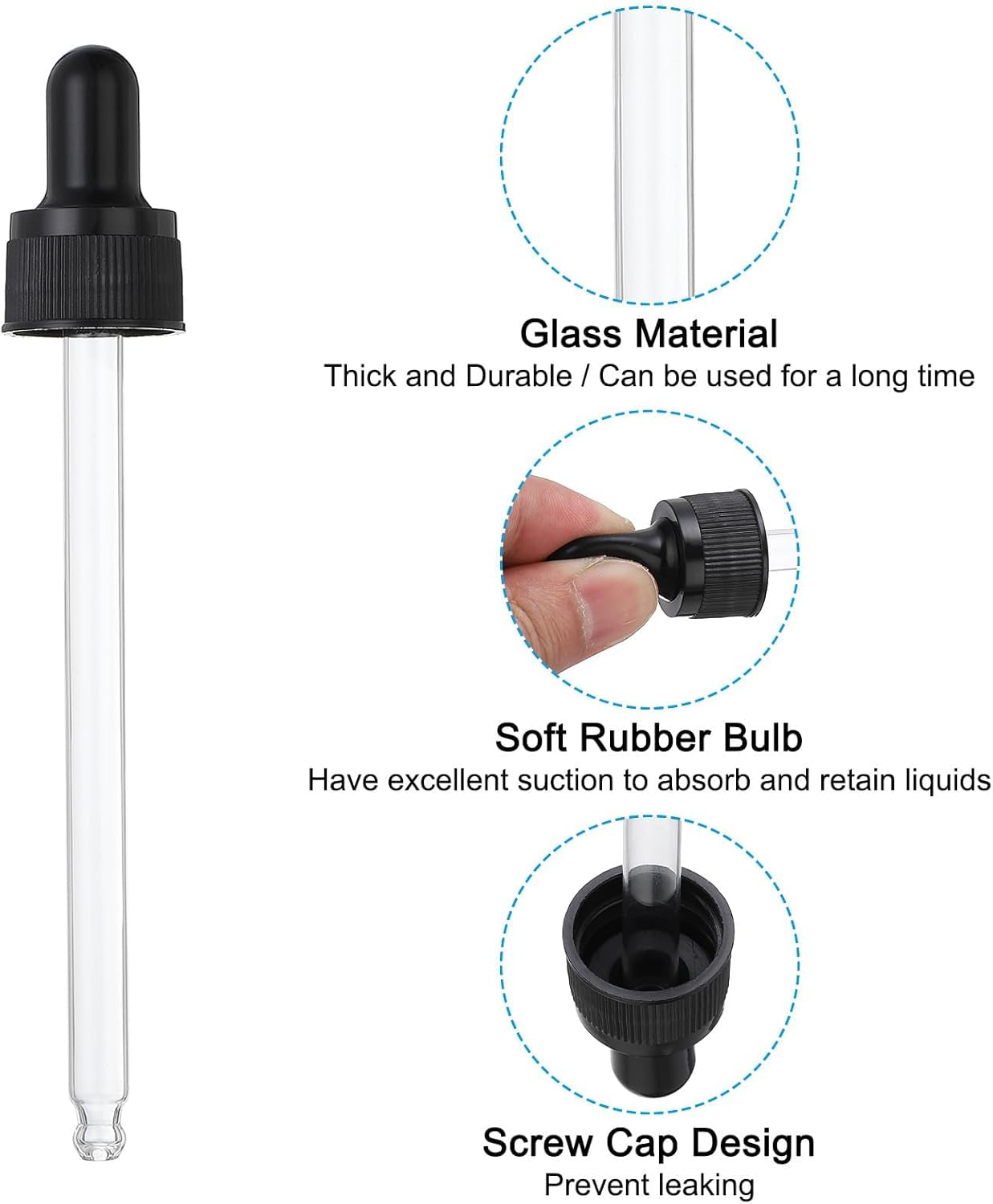 The dropper is widely used in laboratories or homes for experiments, crafts making, or other liquid transferring. It is suitable for essential oils, acids, oil, watercolor, pigment, etc.SpecificationSuitable for 100ml(3.4 Ounce) Essential Oils BottleTotal Length: 130 mm/5.12 Inch;Glass Size: 110 x 7.2 mm/4.33 x 0.28 Inch(L*W)Material: Glass, RubberColor: BlackPackage List: 12 Pcs x Glass DropperAdvantage1. The dropper is made of thick, durable glass material that can be used for a long time. Soft rubber bulbs have excellent suction to absorb and retain liquids. The screw cap design can prevent leaking.2. The dropper and rubber can be taken apart, allowing you to clean and replace the dropper easily.Instruction1. Put the dropper into the liquid bottle or other container, and squeeze the rubber bulb to absorb the liquid.2. Squeeze the rubber bulb to squeeze out the solution.NOTE: Please be careful enough to avoid breaking when using or cleaning the dropper.