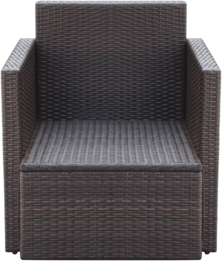 This rattan armchair will make a great addition to your patio living space. It will add a touch of modern elegance to your patio, balcony or garden with its understated, yet stylish design.Made of weather-resistant and waterproof PE rattan, this outdoor armchair is easy to clean, hard-wearing and suitable for daily use. The powder-coated steel frame makes the armchair very sturdy and durable. Thanks to the lightweight construction, it is easy to move and store when not in use.This armchair is delivered with highly comfortable, thickly padded seat and back cushions. The cushion covers are removable and washable.Note 1): We recommend covering the set in the rain, snow and frost.Note 2): This item will be shipped flat packed. Assembly is required; all tools, hardware and instructions are included.Rattan color: BrownCushion color: Cream whiteMaterial: Metal frame + PE rattanCushion material: Polyester cover with foam fillingTotal size: 25.6" x 25.6" x 28.7" (W x D x H)Seat width: 21"Seat depth: 23.6"Armrest height from the ground: 23.2"Seat height from the ground: 12.2"Seat and back cushion thickness: 2"