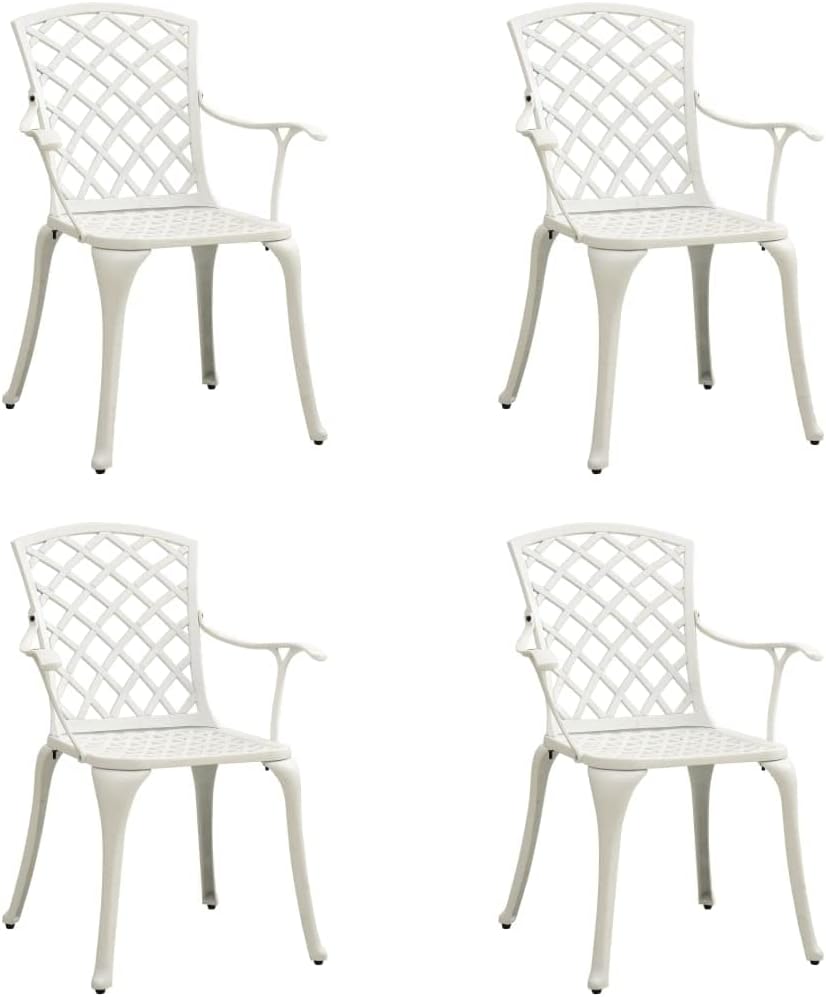 This patio chair set is perfect for having dinner, reading and relaxing with your family and friends.These dining chairs, made of cast aluminium, are sturdy and durable enough to provide long-term service. The rust-resistant and weather-resistant material makes the chairs ideal for outdoor use all year round. The high backrest and seat with a hollow design are comfortable and stylish. Ergonomically curved armrests can effectively relax your arms as well. These chairs are great on their own or complement other furniture sets.Color: WhiteMaterial: Cast aluminumDimensions: 24″ x 23.6″ x 36.6″ (W x D x H)Assembly required: YesDelivery contains:4 x Garden chair