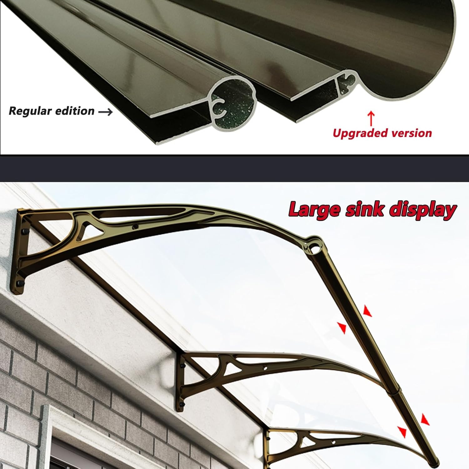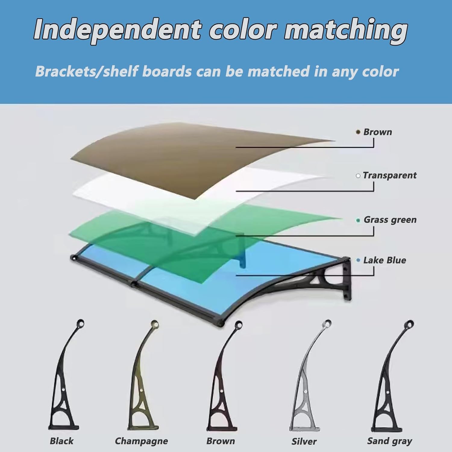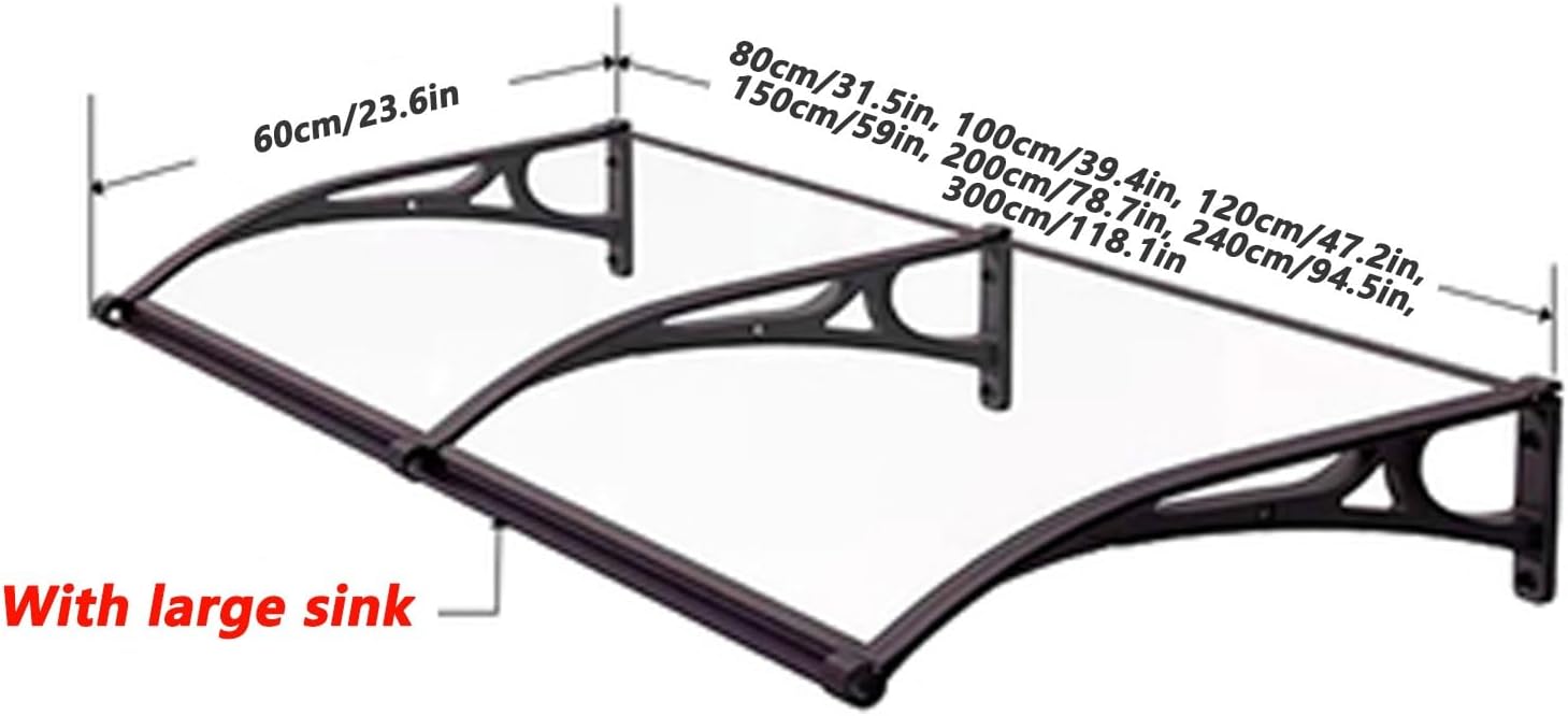 Canopies not only provide an elegant finish to your home, but also perform exceptionally well even in inclement weather. Our clear polycarbonate roof panels, which are so lightweight, are half the weight of glass. The curved design ensures targeted water drainage and the surface of the panels is washable by rainwater. The sealing connection strips we provide can also protect the seams of the canopy to ensure no water leakage.Specifications: 1. Brackets Material: Aluminum alloy2. Hollow Sheet Material: 5.0mm Polycarbonate3. Canopy color: Brown, Transparent color, Grass green, Lake Blue4. Bracket color: Black, Champagne, Brown, Silver, Sand gray5. Product size: 60x80cm , 60x100cm , 60x120cm , 60x150cm , 60x200cm , 60x240cm , 60x300cm , 80x100cm , 80x120cm , 80x150cm , 80x200cm , 80x240cm , 80x300cm , 100x100cm , 100x120cm , 100x150cm , 100x200cm (WxL, can be customized)6. Suitable for: Domestic Eaves Canopy7. Whether to install: Yes (refer to the installation diagram)Other advantages of canopies:1. 100% transparent colorless window top, excellent lighting and perspective effects, beautiful blue sky on sunny days, rain, snow, rain and snow.2. The arc-shaped design maintains the tension and ensures that the rainwater flows out from the edge of the awning to achieve the self-cleaning effect.**IMPORTANT REMINDER:1. Before placing an order, please measure your window or door size to make the right decision.2. Due to manual measurement, there may be an error of 0-0.08in, please understand.3. Installation Note: There needs to be a 0.2in gap between every two canopies.