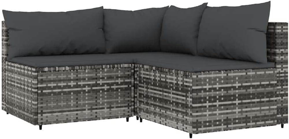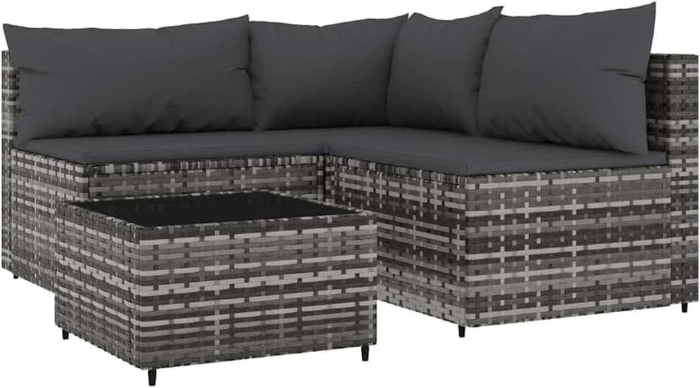This 4 Piece Patio Lounge Set is made for outdoor fun, blending good looks and practicality in a smooth design that makes lounging a real treat. The sleek grey color and modern lines are great for sprucing up your garden, terrace, or balcony, inviting friends and family to kick back in style.The stylish design is perfect for modern outdoor spaces, creating a welcoming vibe for both gatherings and solo relaxation.With its modular pieces, you can shift the seating to match any occasion, whether you're having a BBQ or enjoying a quiet night under the stars.Made from weather-resistant poly rattan, this set is built for durability and won't lose its good looks, no matter the weather.The comfy cushions provide top-notch comfort, letting you unwind for ages while enjoying the outdoors.This versatile outdoor sofa set seats up to 4 people, making it spot on for gatherings, parties, or just lounging with a good book.Color: Grey Shape: RectangularMaterial: Synthetic Poly RattanFinish: Powder-Coated Indoor/Outdoor: Outdoor OnlyCover Included: NoRoom: Garden and terraceMaximum Number of People: 4Dimensions: 19.7 x 19.7 x 11.8 in (W x L x H)Surface Height: 0.41 inWeight: 52.54 lbsSeat Depth: 24.8 inSeating Capacity: 3Swings: NoDelivery Contains: 1 x Corner sofaAssembly Required: YesRecommended Number of People for Assembly: 2