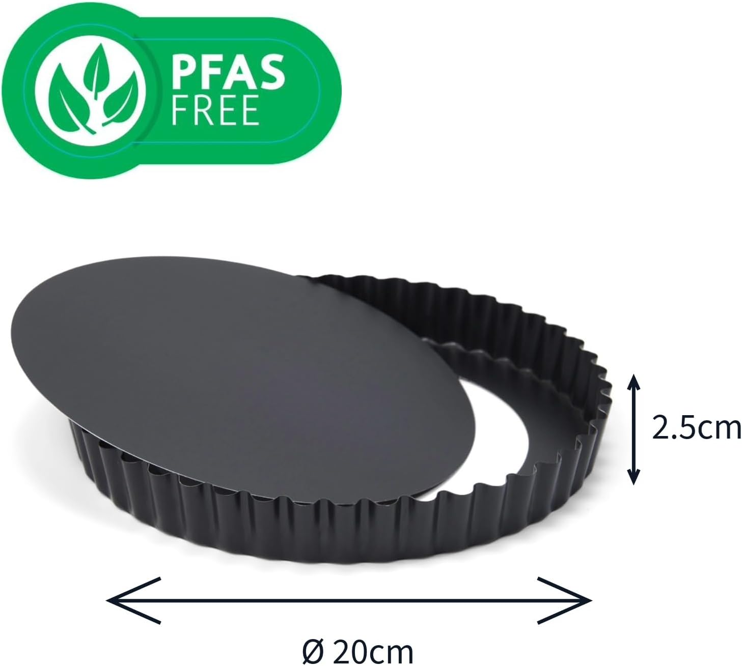 NEW Patisse Quiche Pan w/removable bottom item # 02854, Non-Stick Coated especially designed for use in most generic Air Fryers also suitable for conventional oven use, black color, size 7-7/8" (20 cm) diameter and 1.2" high(3.0 cm) made of ECCS steel, 0.30 mm thickness, All made in Europe.