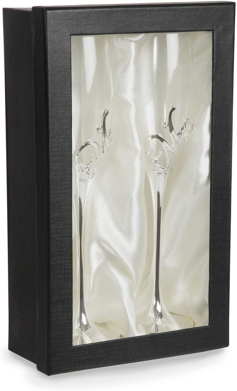 • PREMIUM QUALITY: Set of two wedding-themed champagne flutes, packaged in an open-faced box, is made from glass and zinc.