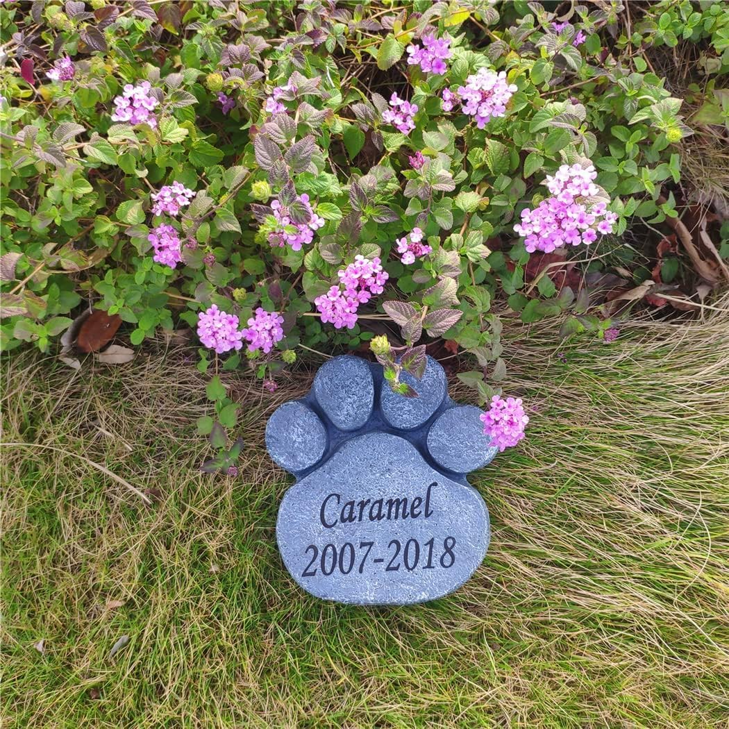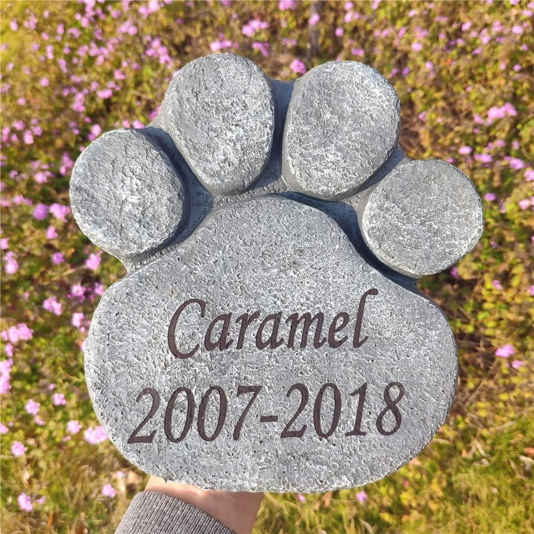 A surprising dog loss memorial gift: Express your sincere emotions The dogmemorial stone is a perfect gift to express sympathy comfort remembrance healing.This beautiful dog memorial stone helps a sad friend or loved one remember their special furry friend.1.Perfect Design: Realistic dog paw print as if the footstep of your lost beloved one left in your courtyard keeps you and your dog together in spirit forever. 2. Customized including pet's name and born passed dates both optional.Laser engraved and then hand paint it with water-resistant paint will last forever.3. Measurement: Size 8 x 8 x 1.6 inches and Weight 1.7 pounds It's easy to find even outdoors.4. Material: Made of high quality poly resin sun-resistant and waterproof hard to be damaged suitable for indoors and outdoors.5.Well-packed protected with special materials there is absolutely no need to worry about damage during transportation nice gift choice.NOTE: Please reconfirm the personalization information before placing the order.IngredientsResinDirectionsgarden stone
