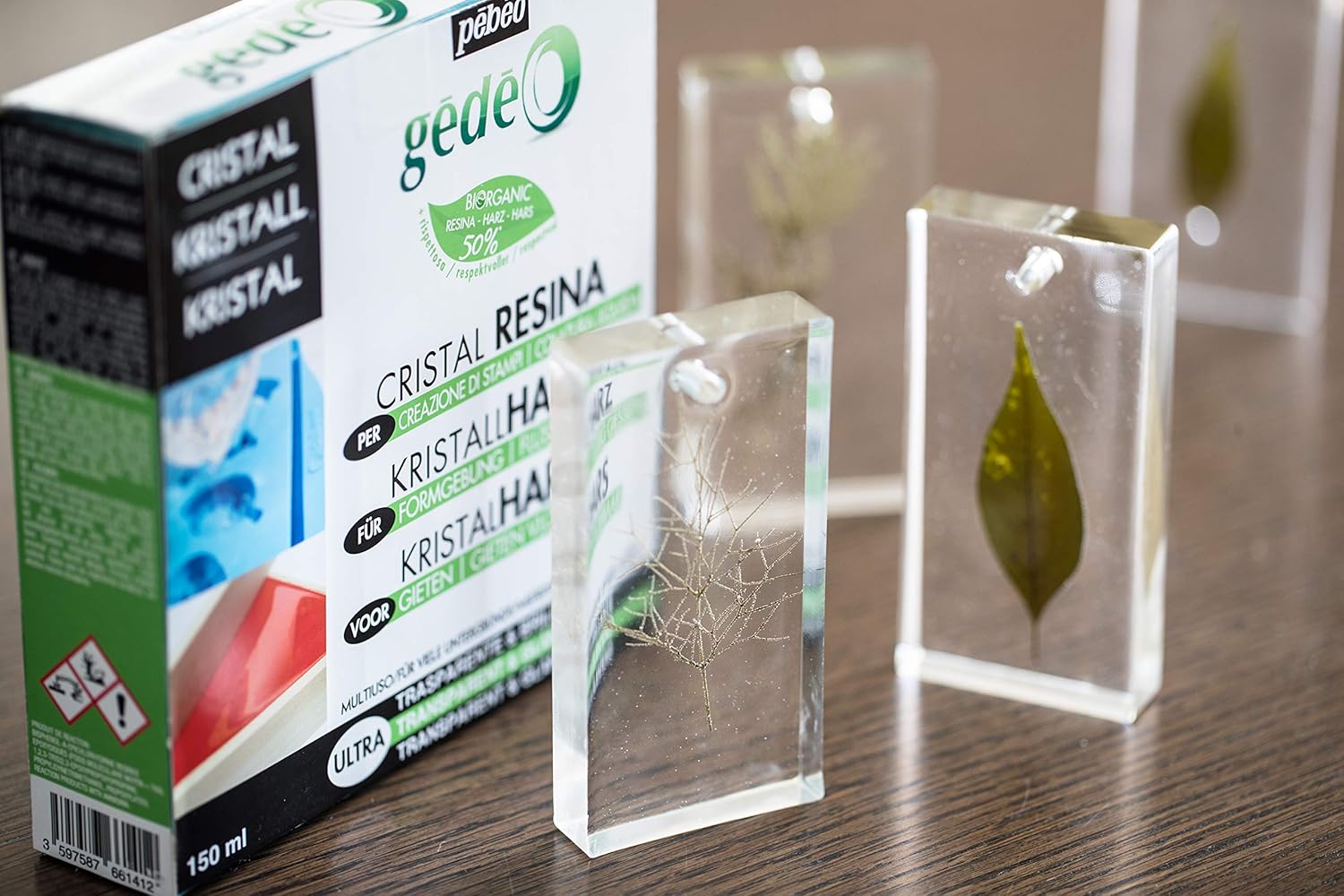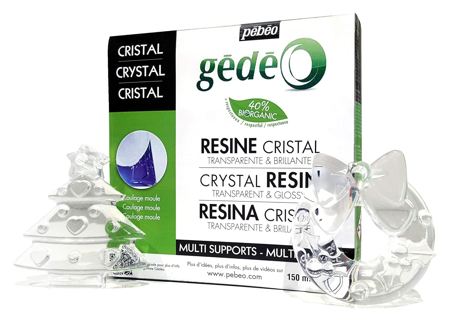 Pebeo Gedeo Bio-Based Resins are made of two components — resin and hardener — and produce a bubble-free, non-yellowing finish that's transparent, glossy, and solid. Low odor and easy to use, they're also more respectful of the environment and safer for artists. - Pebeo Gedeo Bio-Based Resin - Crystal Resin, 300 mlGedeo Bio-based Resin, !H CRYSTL RESN 300ML - Bio-based at more than 50%, Crystal Resin has a liquid texture ideal for pouring in molds, small bordered surfaces, and inclusions (including natural elements, such as dried leaves).