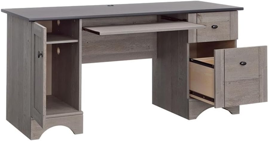 Create a contemporary and functional workspace with the Pemberly Row Engineered Wood Computer Desk in a striking Mystic Oak with Raven Oak Accent finish. This computer desk offers a spacious work surface and convenient storage drawers, promoting organization and productivity. The Mystic Oak with Raven Oak Accent finish adds a touch of sophistication, making it a delightful addition to your home office.Features:- Finish: Mystic Oak- Material: Engineered wood- Features a slide-out keyboard/mouse shelf.- Easy-gliding drawers.- Lower drawer holds letter or European size hanging files.- Space for CPU tower behind door.- Adjustable shelf.Specifications:- Product Dimensions: 29.016" H x 59.449" W x 23.465" D- Product Weight: 100.533 lbs.