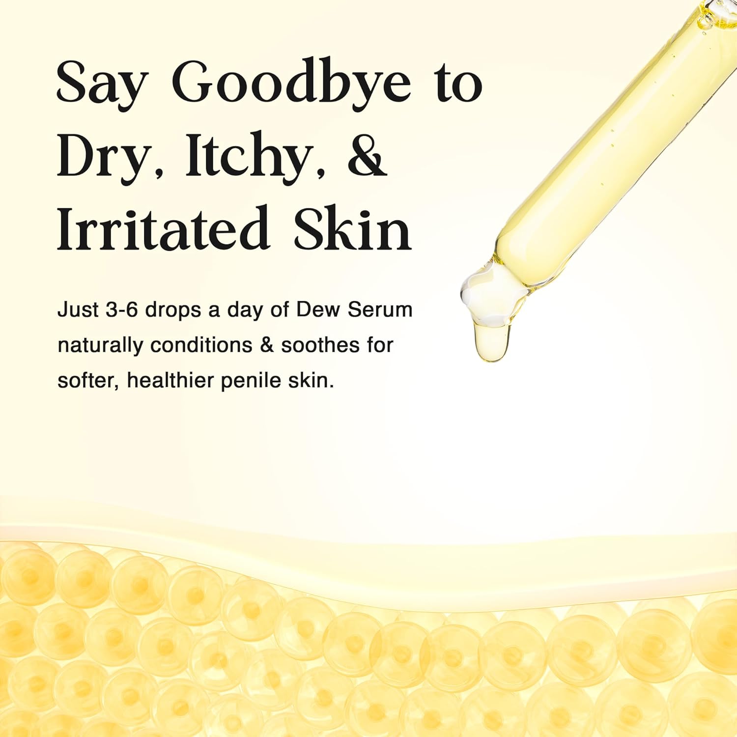 New to Amazon! Dew Serum: Advanced penile skin hydration. Premium oils contain vitamins: A, B-Complex, C & E. Over time, men can start to lose sensation in their skin, particularly if cut. Skin gradually thickens on the head (the 'glans') in a process known as keratinization. Without the natural protective hood, moisture is lost and sensation can decrease. By adding just a few drops of our luxurious serum to your daily skin care routine, you should notice improved skin texture over time as the tough penile skin becomes infused with nourishing oils. May also help with manual stretching for phimosis. Why men are choosing to moisturize their skin with our moisturizing serum: ✓ Non-greasy: DEW hydrates like an oil but absorbs like a cream. No greasy residue. ✓ Easy to apply: Gently massage a few drops into the skin after a shower or bath until fully absorbed. ✓ Feels and smells fantastic: All-natural. Nothing added. Nothing taken away. ✓ Fast absorption: Apply, forget, and enjoy. ✓ No nasties: You won't find the usual harmful additives, preservatives, dyes or fragrances in our serum. Let your manhood bask in the silky glory of Coconut, Argon, Aloe, Jojoba, Lavender, and Bergamot. This blend of premium ingredients is packed with natural vitamins & anti-inflammatories to help promote healthy skin. It adds long-lasting moisture, and relieves dry, rough skin to have you feeling your best again. ✓ Money back guarantee: If you’re not happy, return the product. Dew Serum is produced in the USA and we want you to love it. HOW TO USE: Simply apply 3-6 drops to skin and massage gently until absorbed once or twice a day. A great time to do this is after bathing and /or before bedtime so that the skin has all night to benefit from the product. Cut users may also cover the organ with a hood or covering to increase moisture retention if desired.