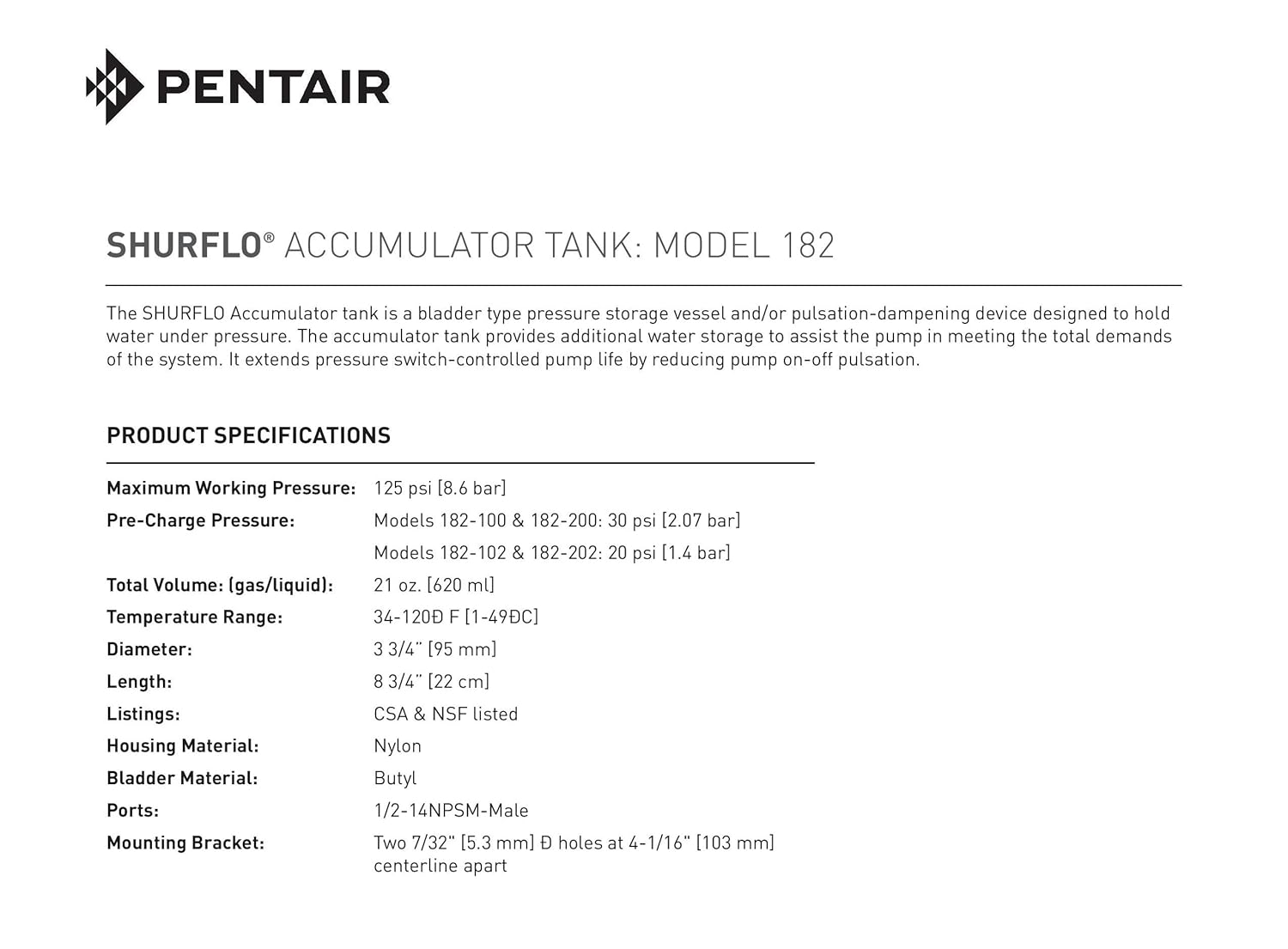 The PENTAIR SHURFLO Accumulator Tank is engineered to protect your pump, improve water system efficiency, and enhance performance. By reducing cycling and pressure spikes, it extends pump life, minimizes energy use, and provides smoother water flow, making it ideal for RV, marine, and industrial applications. Pre-pressurized to 30 PSI, with a built-in diaphragm, this 24 oz nylon tank supports system pressures from 20 PSI to 125 PSI. It dampens faucet pulsations and helps maintain consistent water pressure, reducing wear on pumps and plumbing components, while improving overall system performance. Constructed with a durable nylon housing and a butyl bladder, the tank features 1/2-14 NPSM-Male ports and compact dimensions of 3 3/4” diameter by 8 3/4” length. CSA and NSF listings ensure quality and safety, making it a reliable solution for extending pump life and stabilizing water flow in recreational vehicles, boats, or industrial water systems.