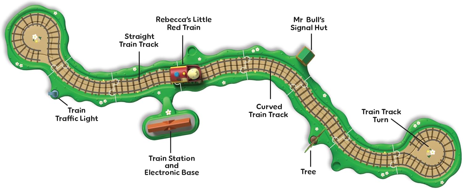 Included Components 6 Pieces of Train Track, 2 Train Track Turns, 1 Rebecca’s Little Train, 1 Mr Bull’s Signal hut, 1 Train Traffic Light, 1 Tree, 1 Train Station, 1 Electronic Base