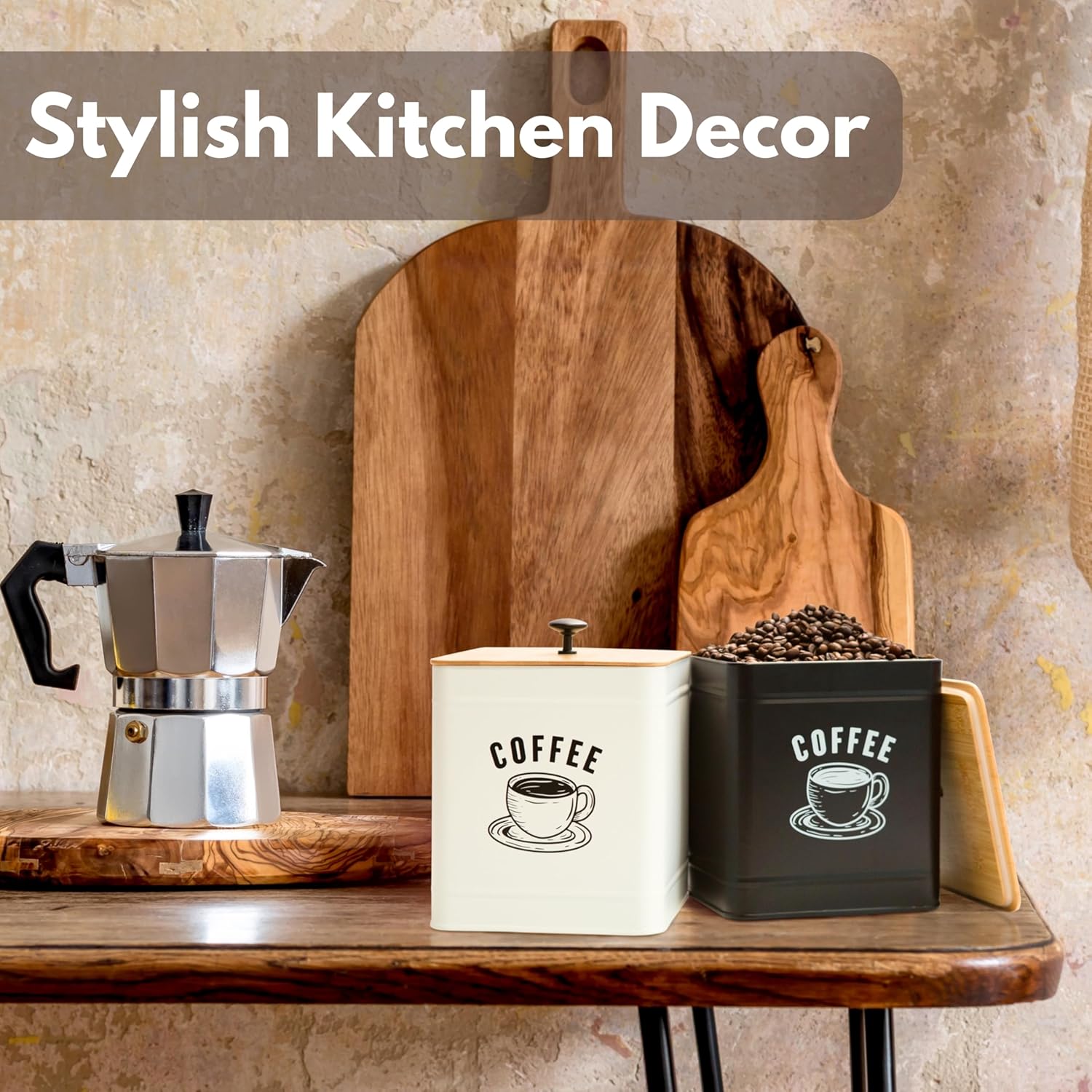 his 6.3 x 7.8 inch coffee canister&cookie jar offers a spacious 40 oz capacity while saving counter space. Its airtight bamboo lid with rubber lining keeps coffee beans, grounds, or pods fresh by blocking air, moisture, light, and heat. Made from durable iron, it's lightweight, shatter-resistant, and easy to clean—ideal for busy kitchens with kids or pets. With a sleek matte black finish and natural bamboo lid, this stylish container suits any décor and keeps your coffee neatly stored and within reach.