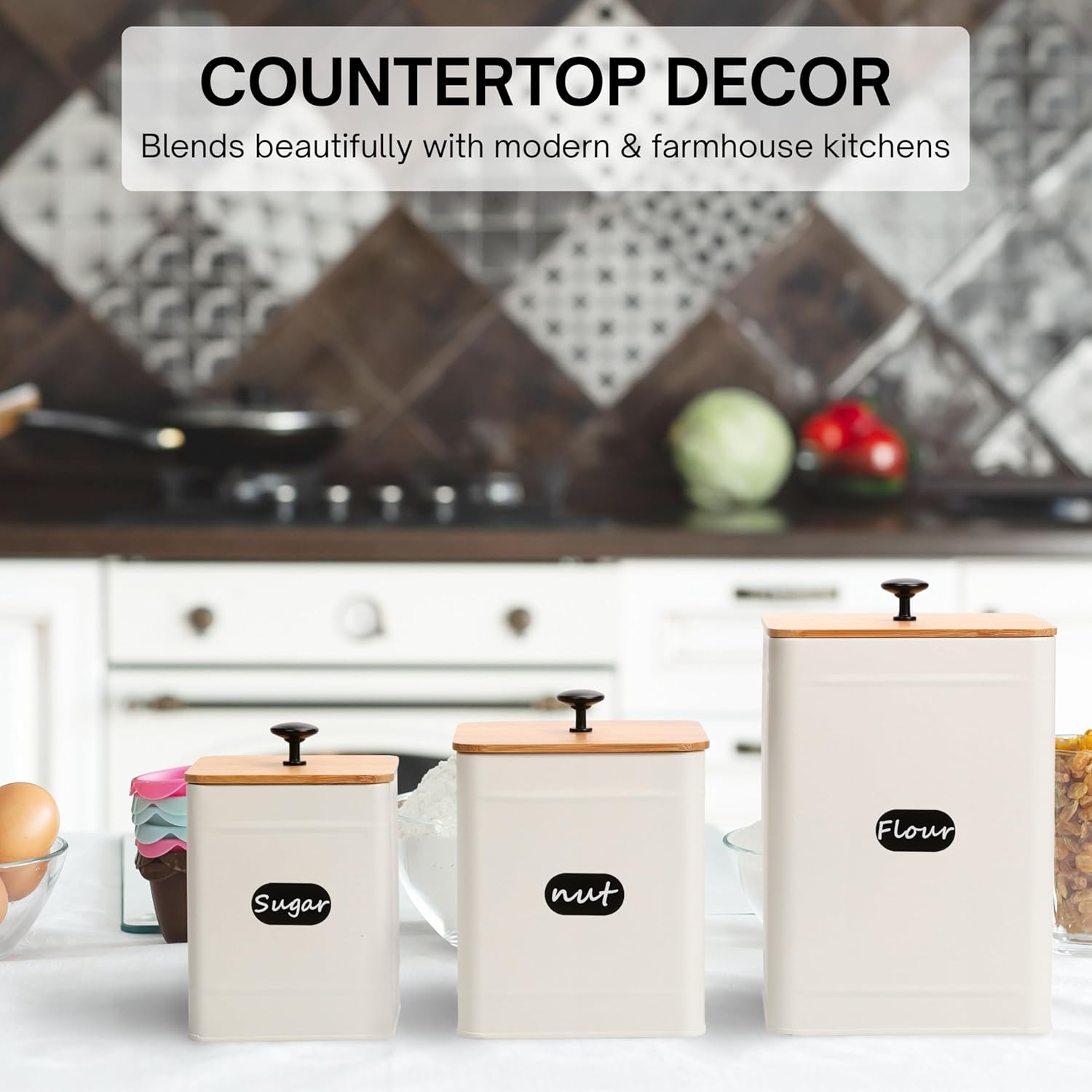 This 3-piece kitchen canister set combines function and style with its durable powder-coated metal build, bamboo lids, and customizable chalkboard labels. Available in white, these rust-resistant and easy-to-clean canisters offer 3 capacities — perfect for storing flour, sugar, coffee, tea, and more. The sleek design complements both modern and farmhouse kitchens, making them a versatile and decorative countertop solution.